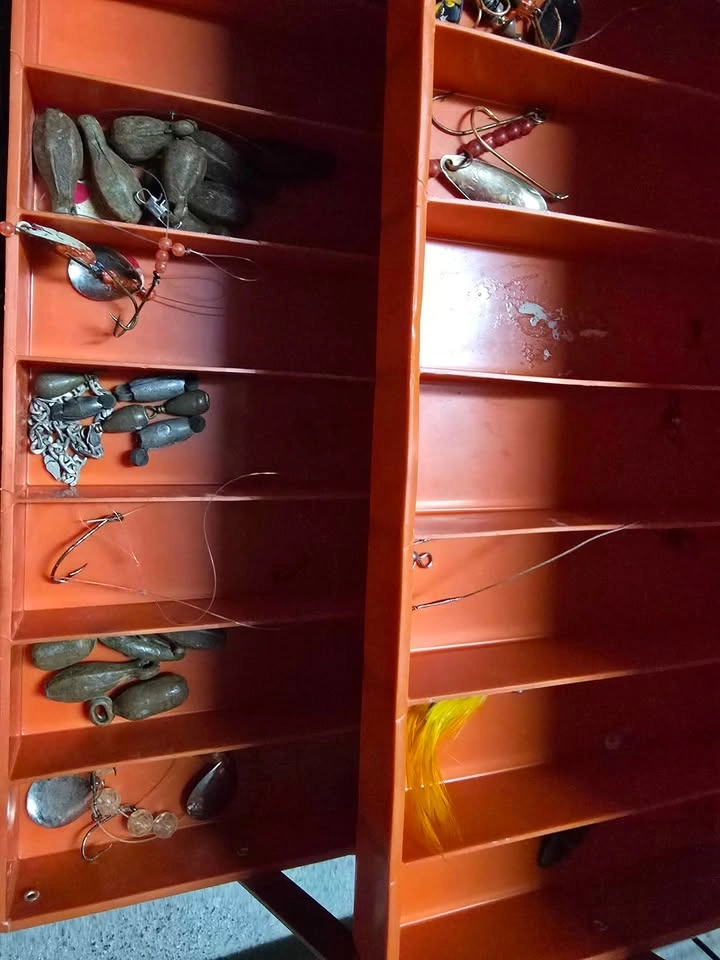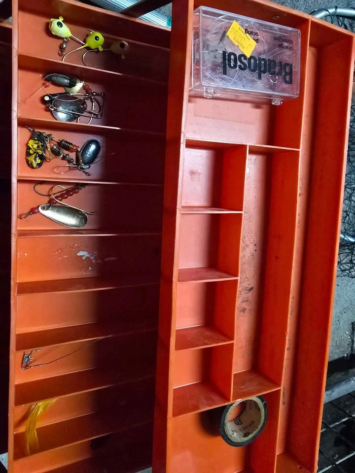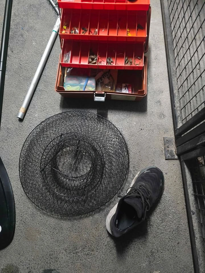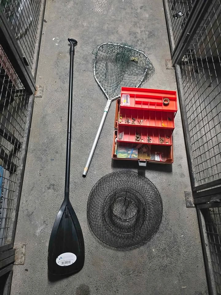 Fishing box with hooks, lures, etc, Netherlands cage, paddle, 2x 6,5' rods. Fish net is sold. Pickup in Etobicoke.