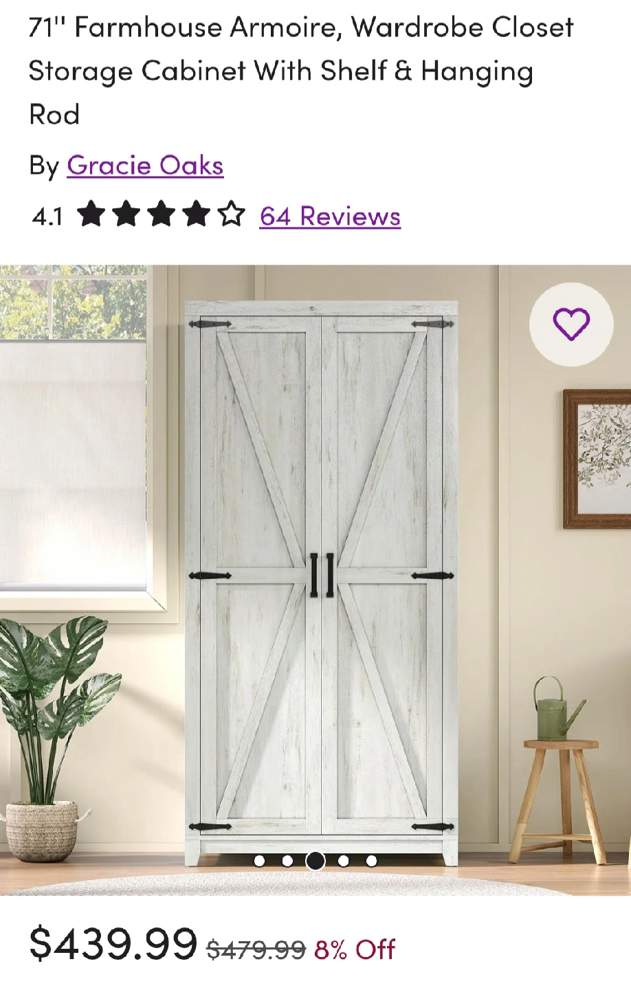 This Gracie Oaks farmhouse armoire is a stylish and functional wardrobe closet. It features a shelf and hanging rod for ample storage. The armoire is 71 inches tall, 32 inches wide, and 20 inches deep. It was originally listed for $479.99 but is now on sale for $439.99. It has a sturdy aluminum clothes hanging pole and stable wooden feet
