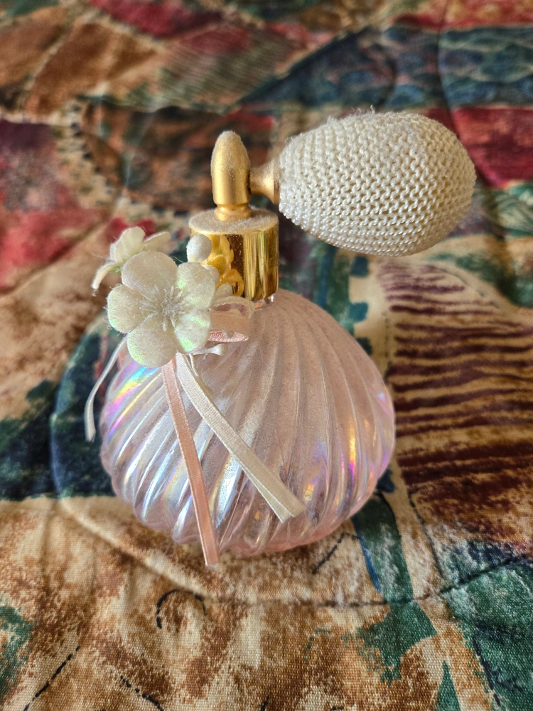 This is a lovely vintage perfume bottle. It's made of pink iridescent glass with a swirled design. It has a gold-tone atomizer and is decorated with small fabric flowers and ribbons. It would make a beautiful addition to a vanity or perfume collection