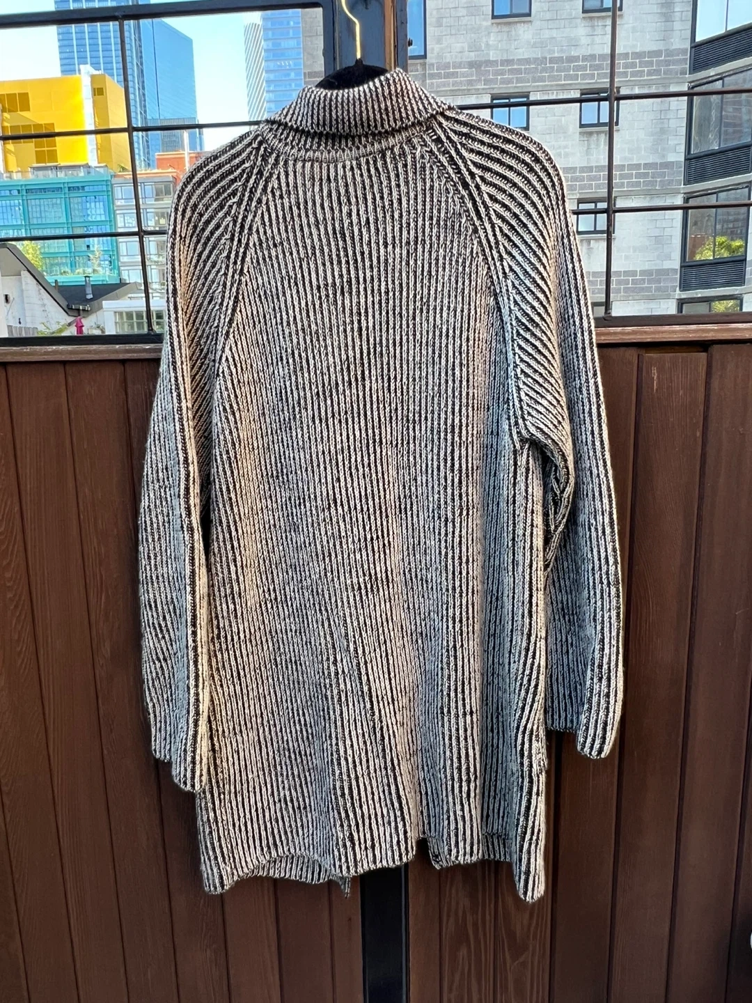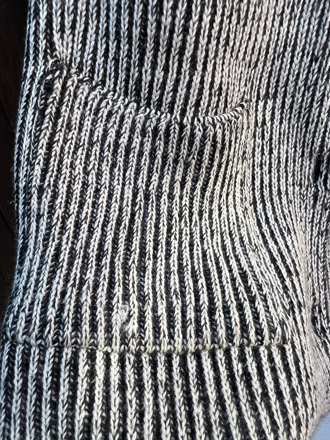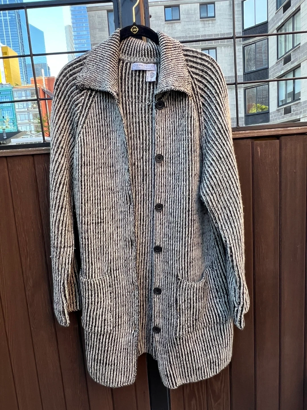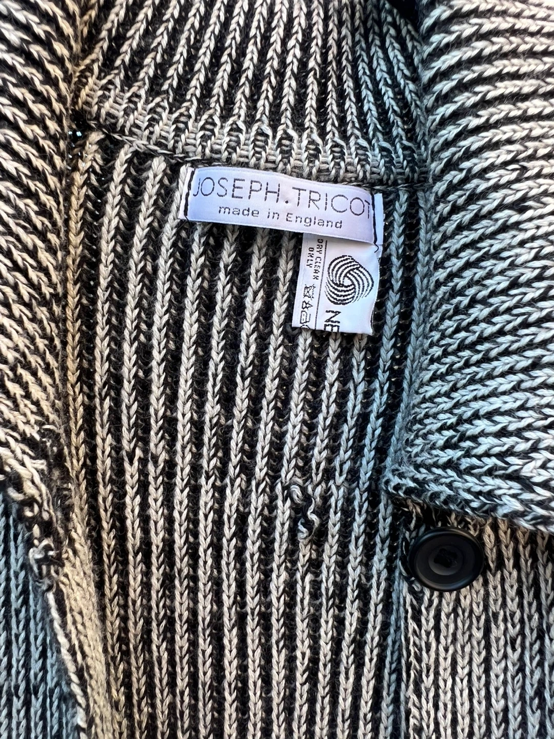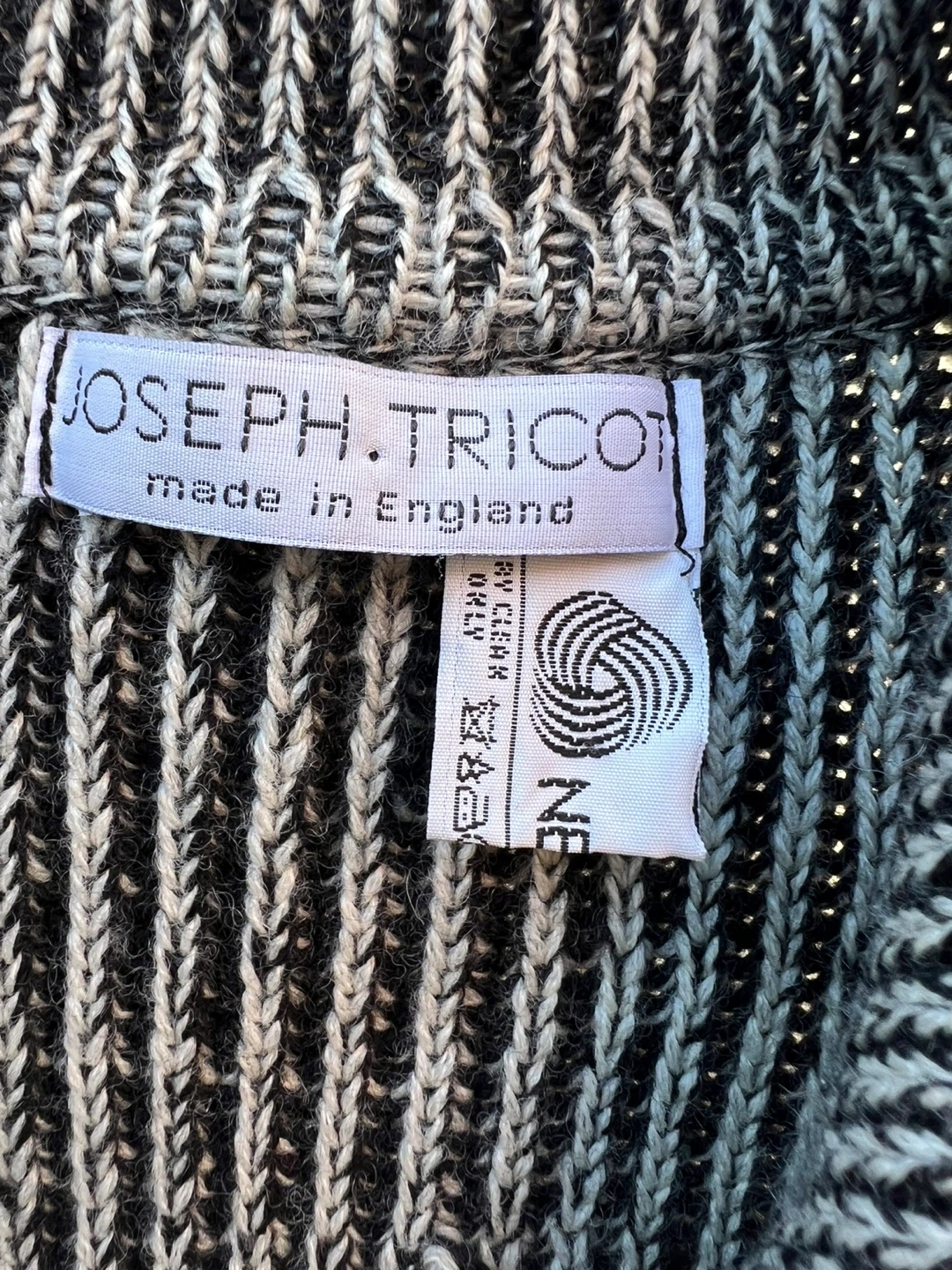 Selling a Joseph Tricot cardigan made in England! It's a lovely wool knit with a black and white striped pattern and front pockets. Perfect for layering!