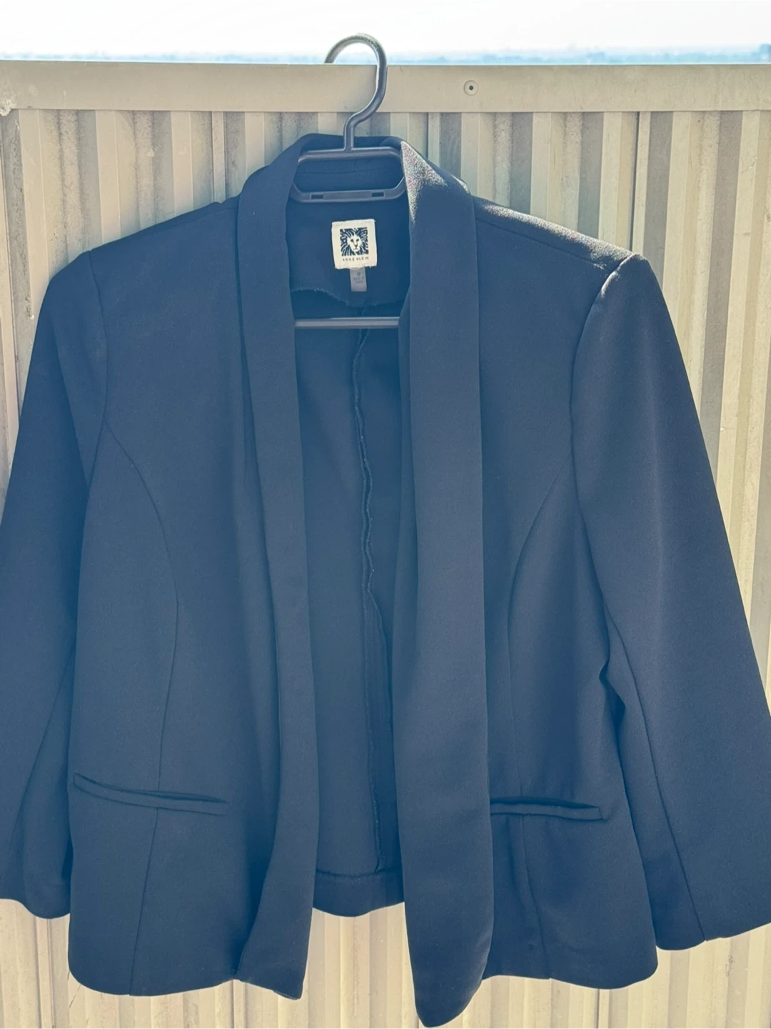 Selling an Anne Klein black blazer in size medium. It's a stylish and versatile piece that can be dressed up or down. Great for adding a touch of sophistication to any outfit!