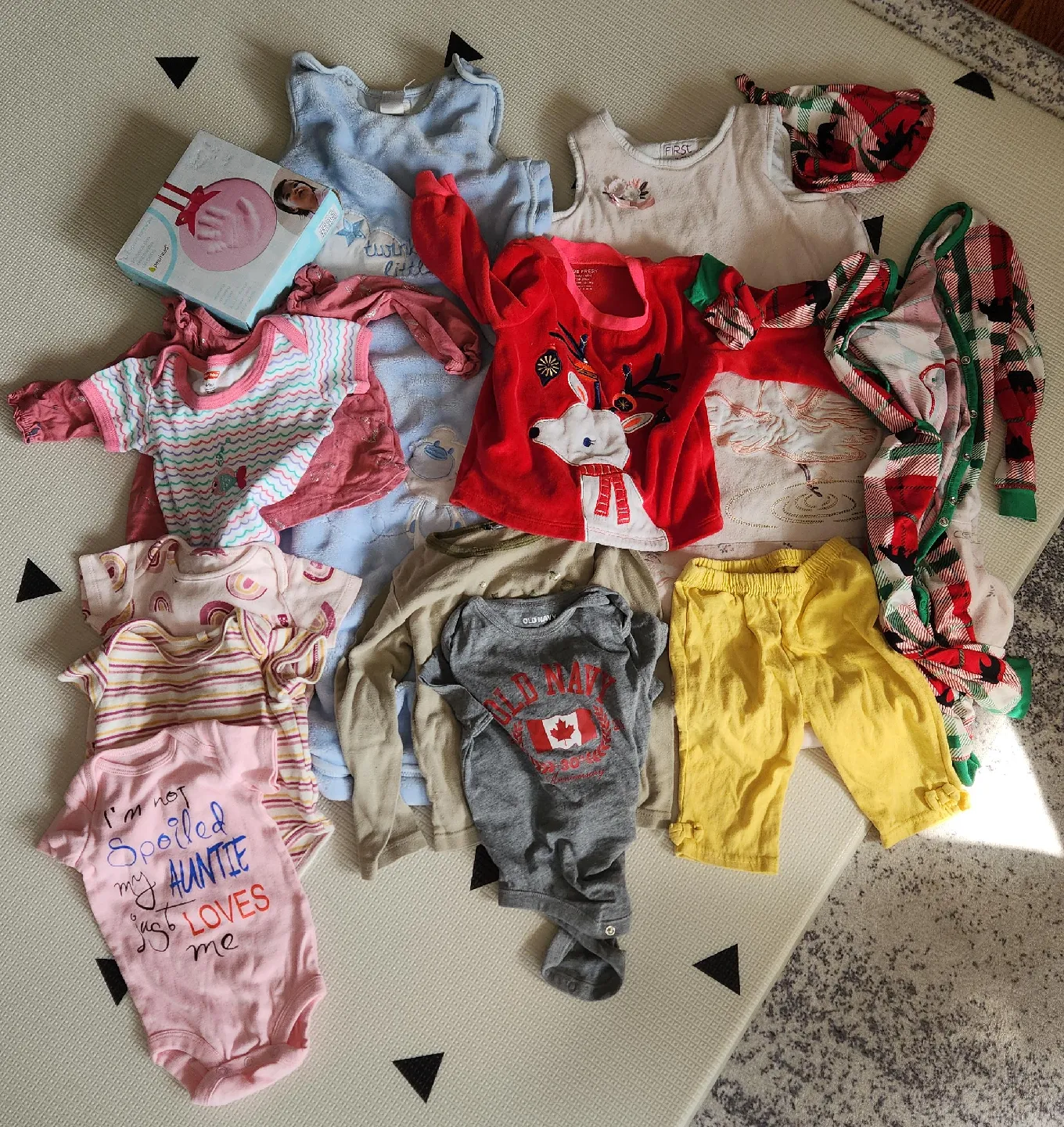 A bundle of gently used baby clothes! There's a mix of onesies, shirts, pants, sleeper and sleep sacks in different colours and patterns. Perfect for a growing little one!