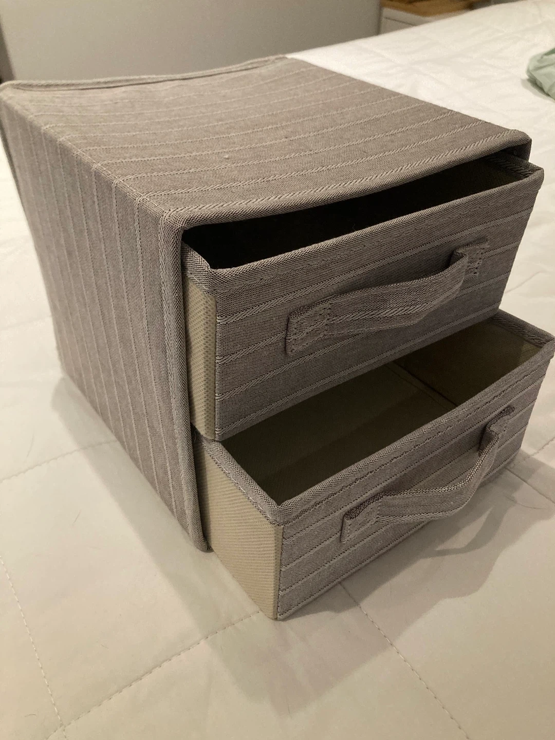 Selling a fabric storage bin with 2 drawers. They're perfect for organizing closets, shelves, or drawers. The bin is in great condition and ready for a new home! It has a nice neutral colour