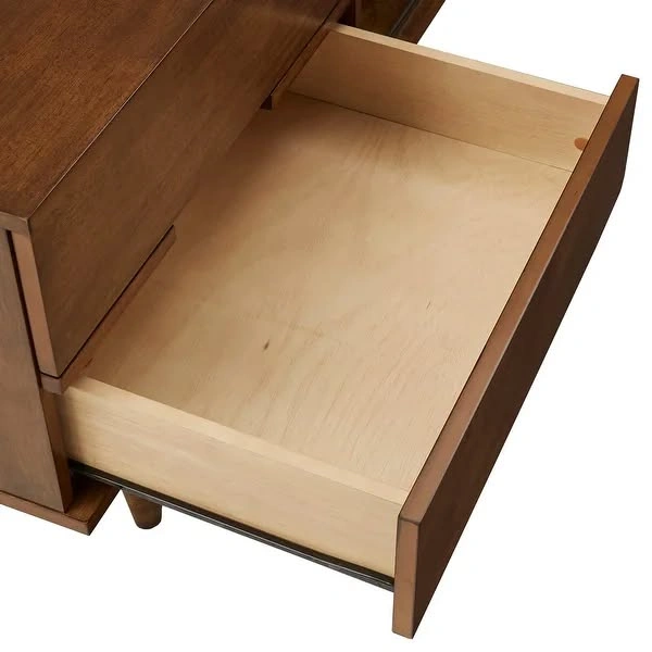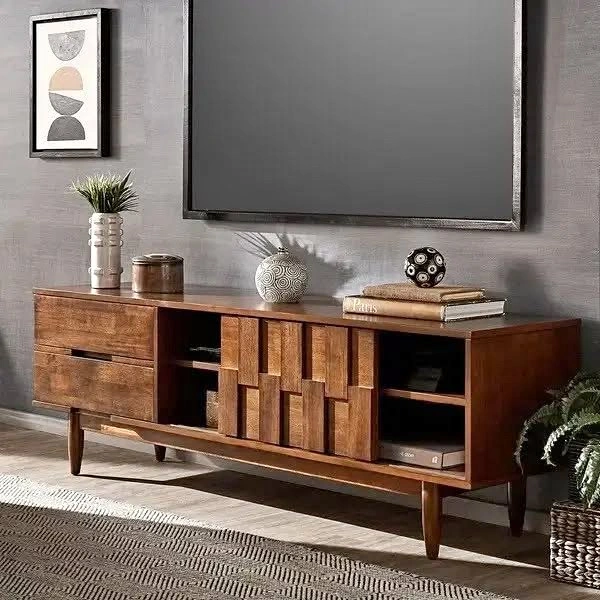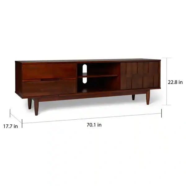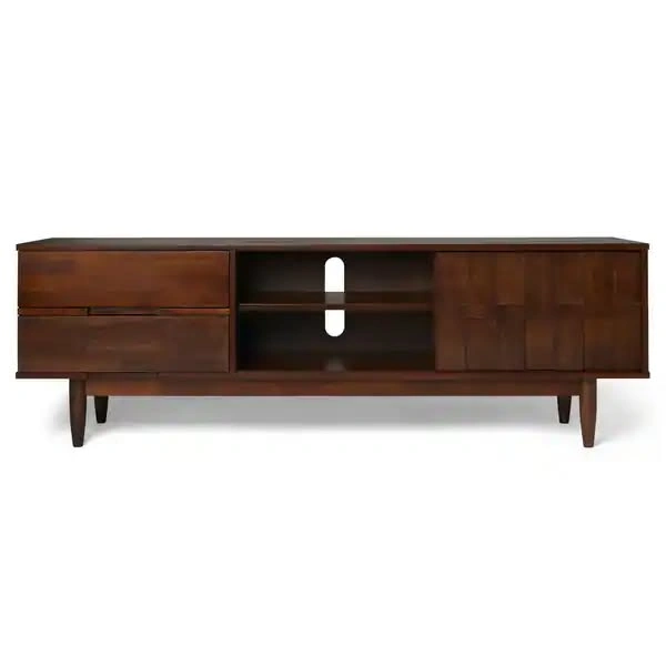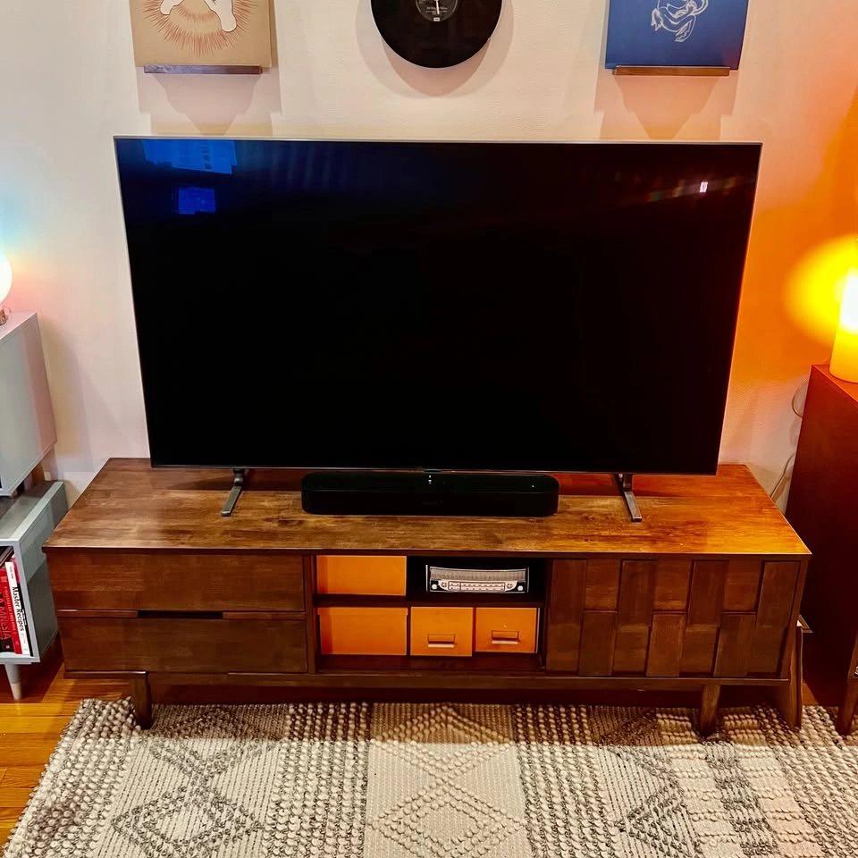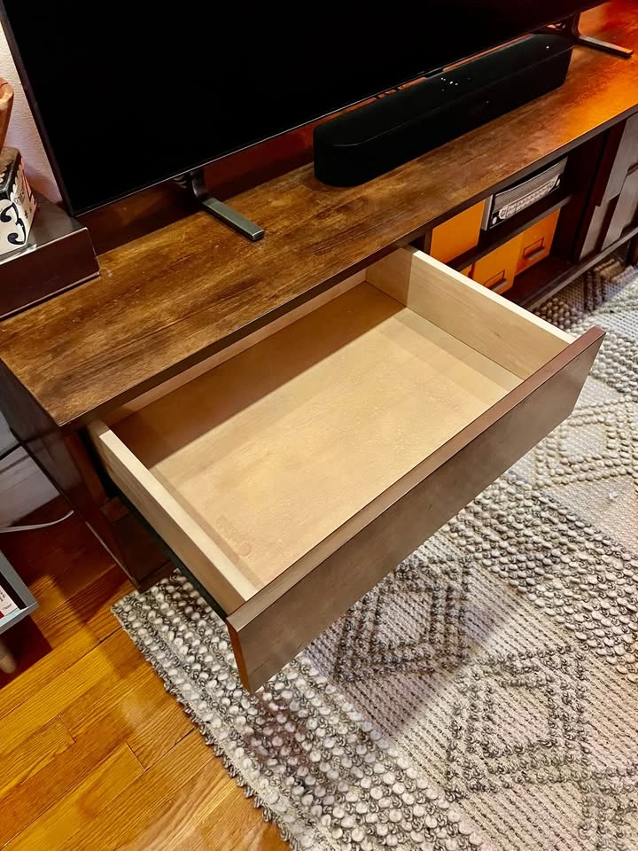 Clean mid-century style 70-inch entertainment center in great condition. The top has very minor, nearly unnoticeable, wear from normal use, but the piece is overall very clean and presents like new. Finish: Tobacco wood tone Size: 70.1 in W x 17.7 in D x 22.8 in H Storage layout: two open shelf bays in the center and right. The sculpted front panel slides left or right so you can conceal either bay and display the other. Both shelf bays have rear cord cutouts, so you can route cables cleanly no matter which side is open. This makes it perfect for both concealing modem/router while providing easy access. Two drawers on the left for concealed storage. Tapered legs, sturdy build. TV pictured on console is 65" for perspective. Stands solid with smooth drawers and shelves, no wobble, no broken parts. Pickup: Hell’s Kitchen, second-floor walk-up, one short flight of stairs. I am moving in late October, so there is no rush. I have some flexibility on pickup and will keep it if it does not find the right home. Retail was $599.