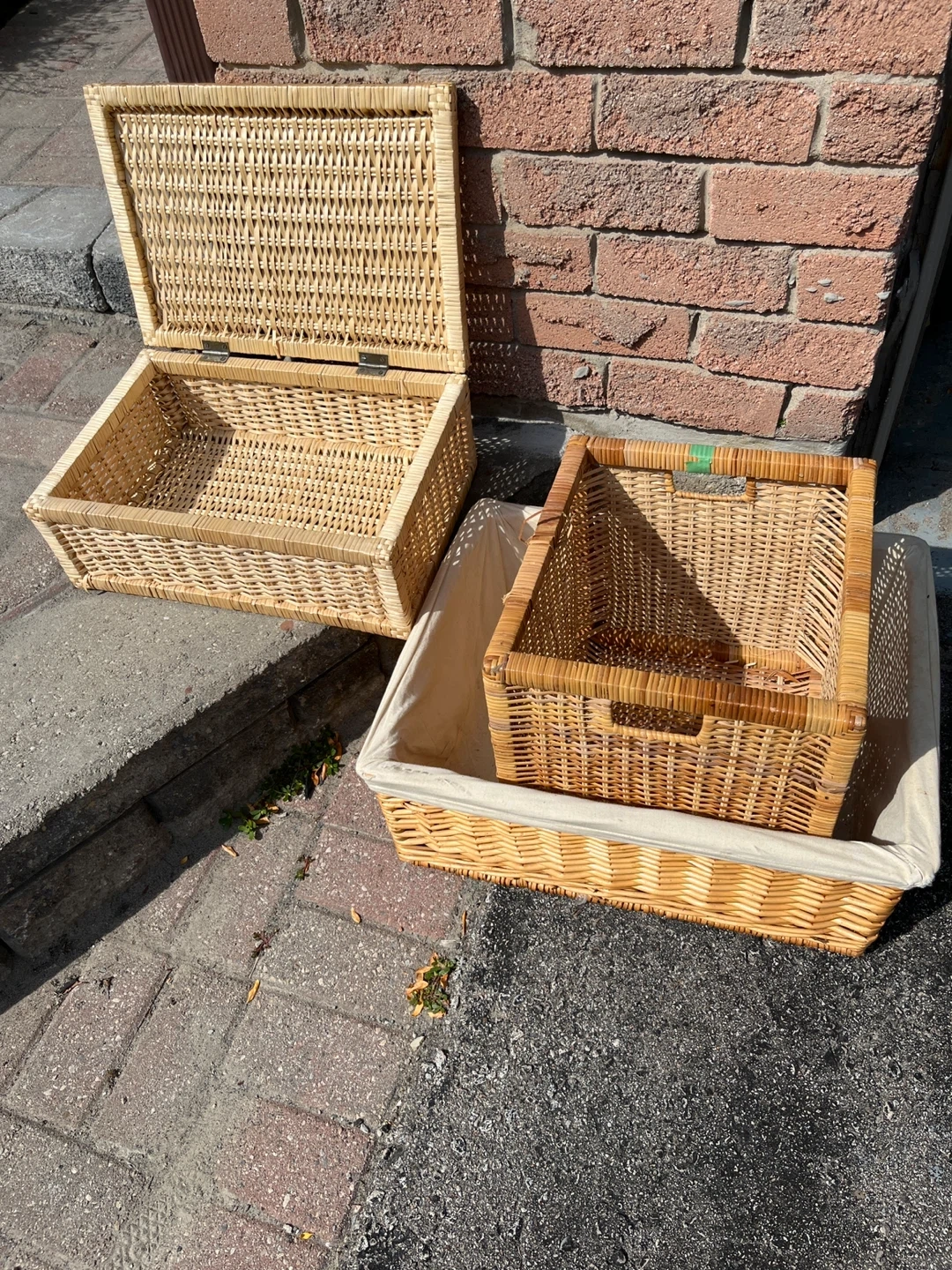 Selling a set of threewicker storage baskets. They're in great shape and ready to help you organize your space! Includes one basket with a lid and one with a cloth liner.