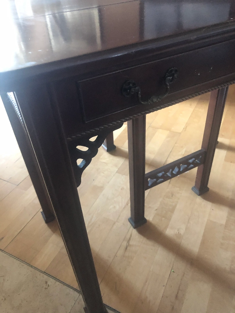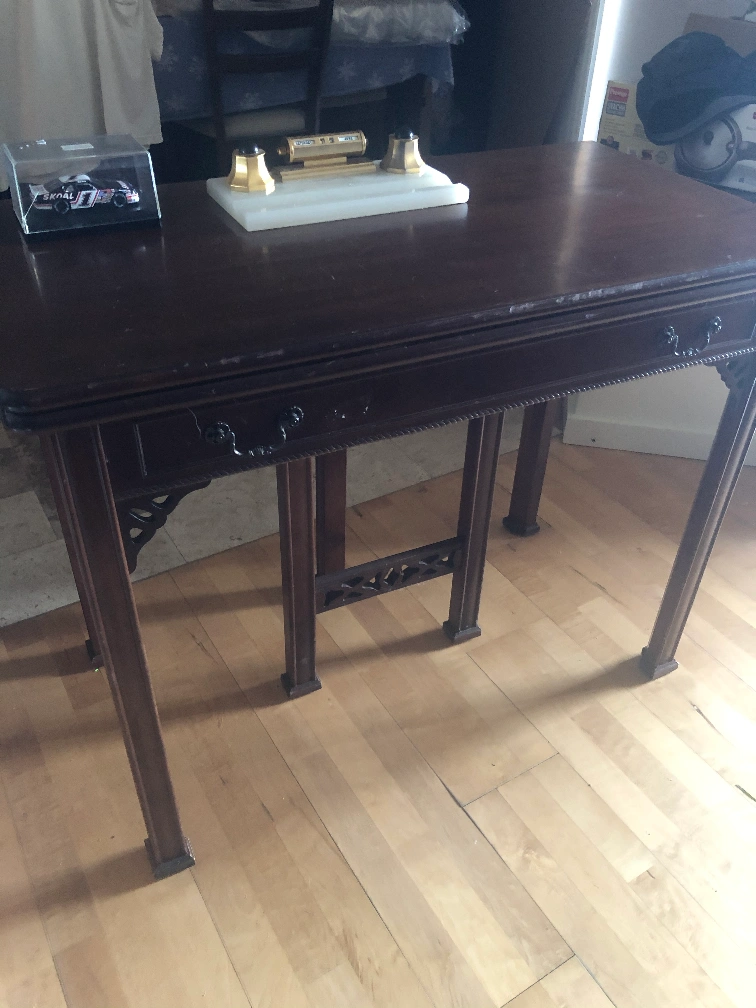 Vintage MCM Canadian made Mahogany, Knechtel style table, in great condition, Rare find. 50cm x 100 cm folded or 100 cm x 100 cm when open (20”x40” or 40”x40”) No holds unless deposit made, e-transfer accepted, pickup in etobicoke or delivery for extra $