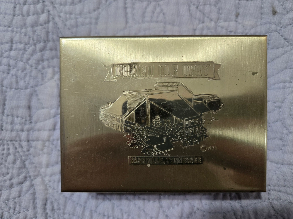 Selling a vintage box featuring the Grand Ole Opry in Nashville, Tennessee. It has a golden colour and some signs of wear. Great for collectors or anyone who loves country music history!