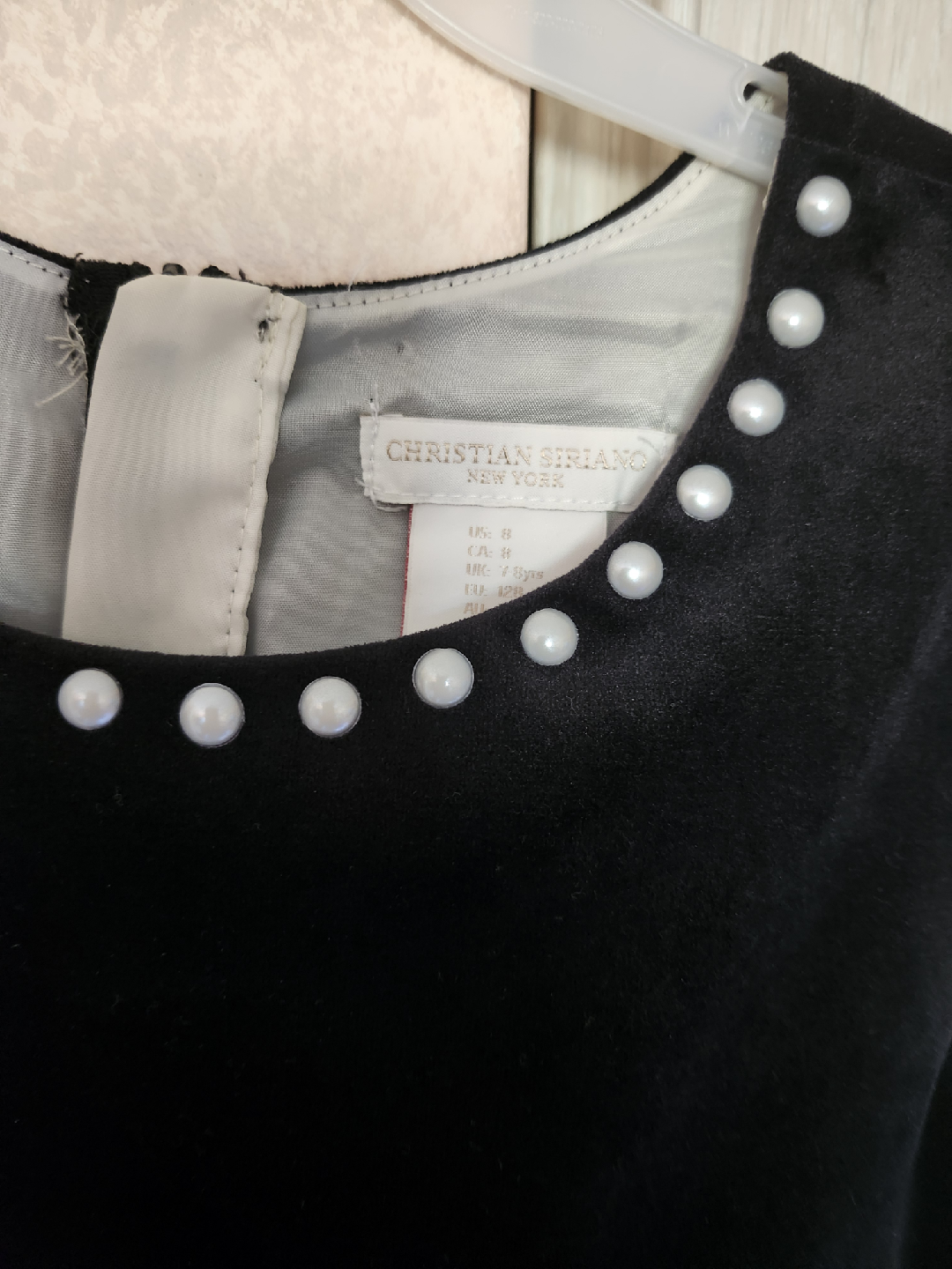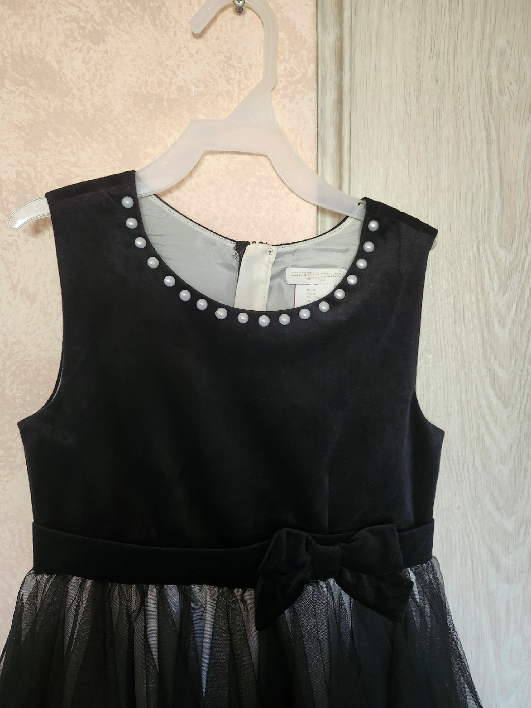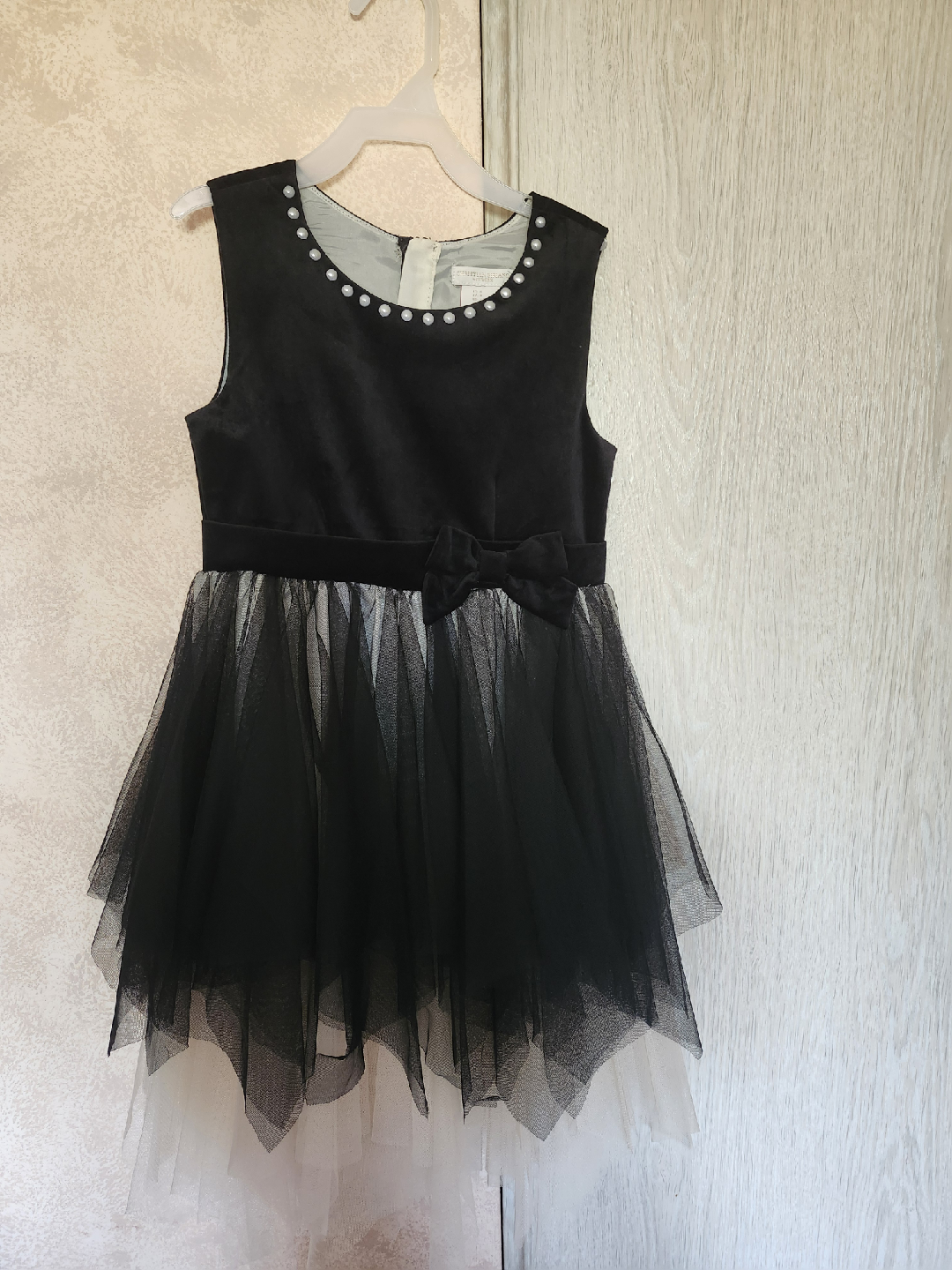 Beautiful layered tulle bottom, bow on waist band and pearl buttons on neck line. Zipper back closure