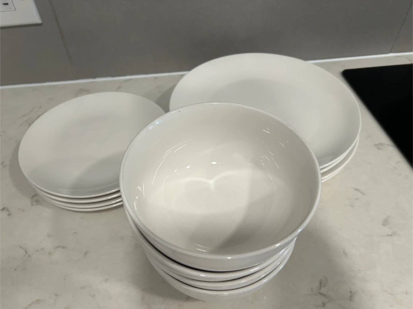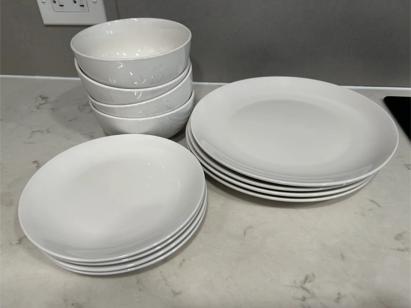Dish Set โ 12 Pieces ๐ฝ๏ธ โข 4 bowls (some scratches, see photo) โข 4 small plates โข 4 large plates Perfect for everyday use! ๐ Pickup only ๐