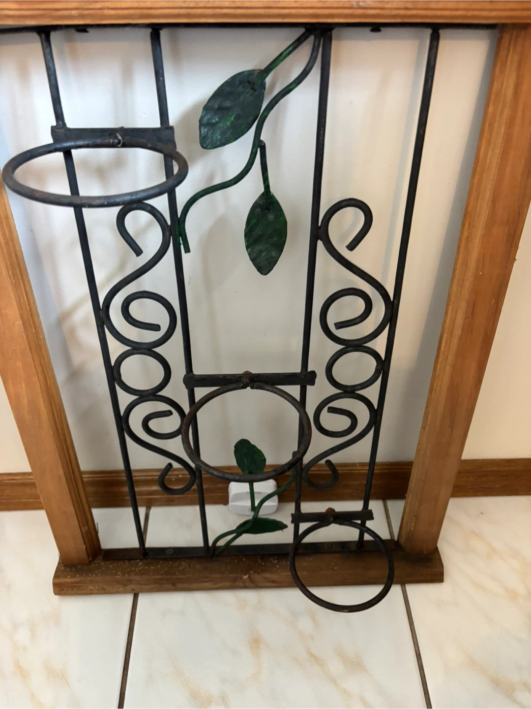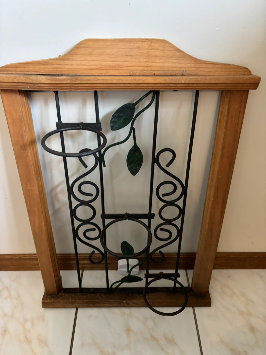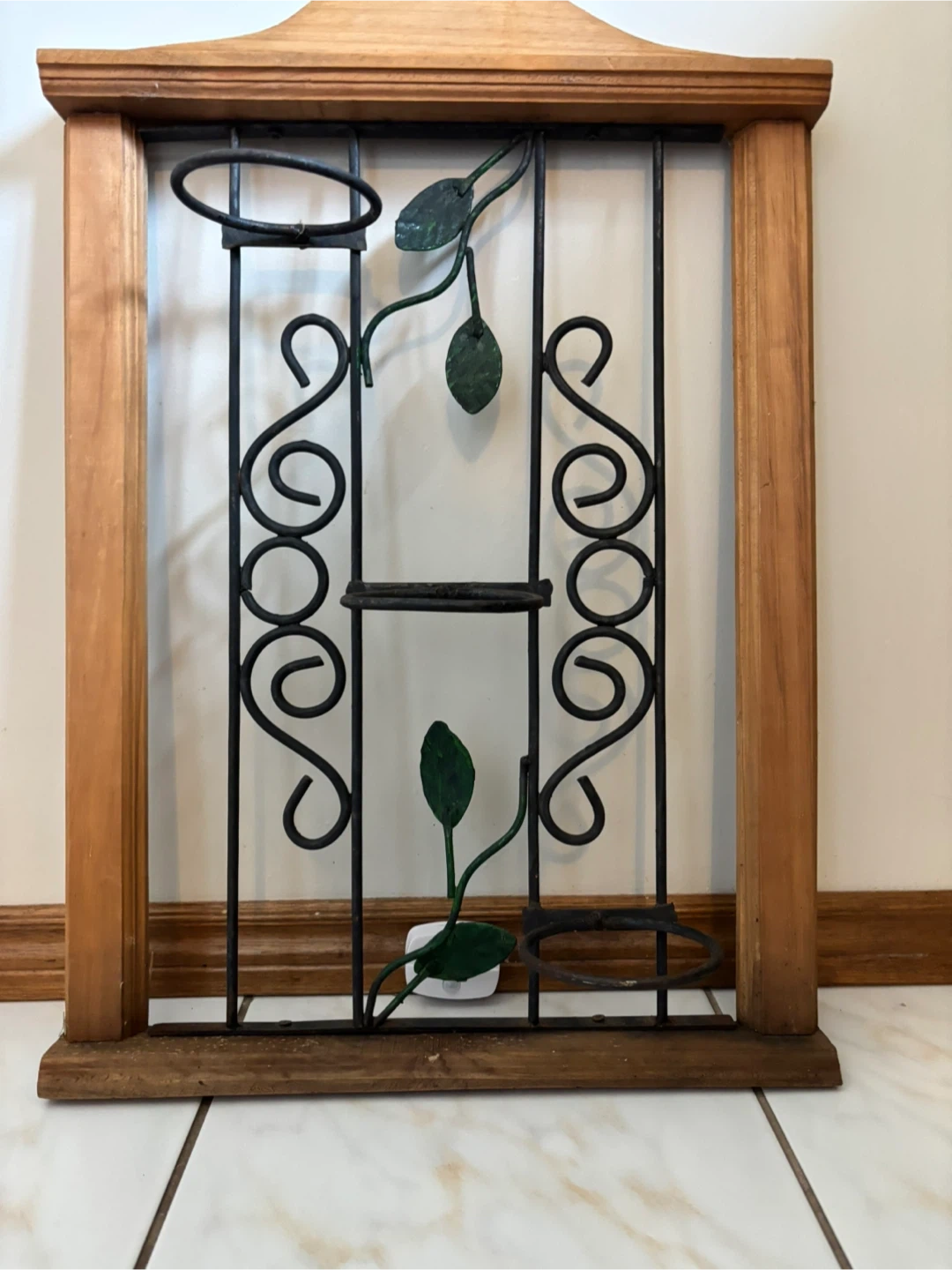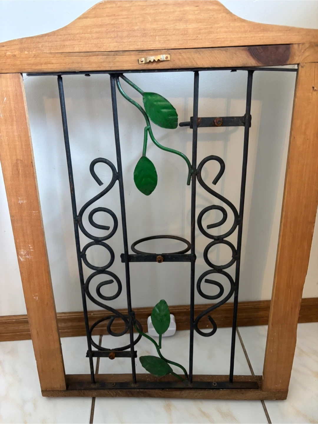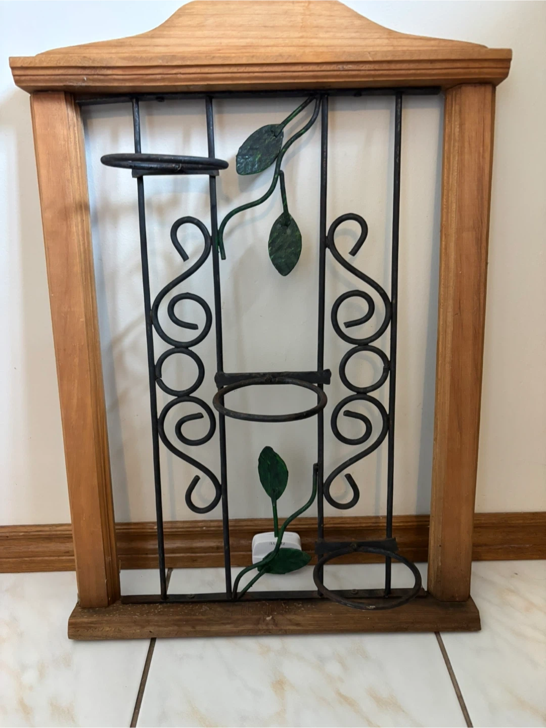 58Unique wall decor piece with a wooden frame and metal detailing. Features a decorative metal design with leaf accents and circular holders. Perfect for adding a touch of rustic charm to any room. 25” by 18”. Cash only.