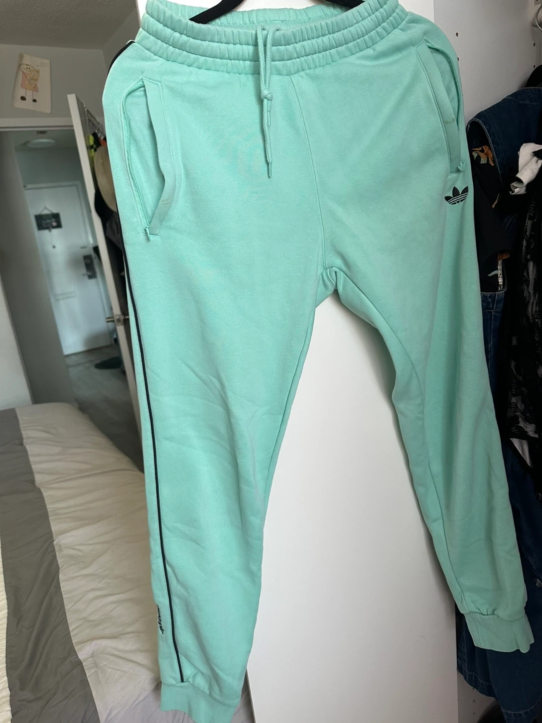 Mint green Adidas track pants! They're in great condition and super comfy. The classic Adidas design with the stripes down the side makes them a stylish choice for lounging or hitting the gym. They have a drawstring waist and pockets too Pay by cash please