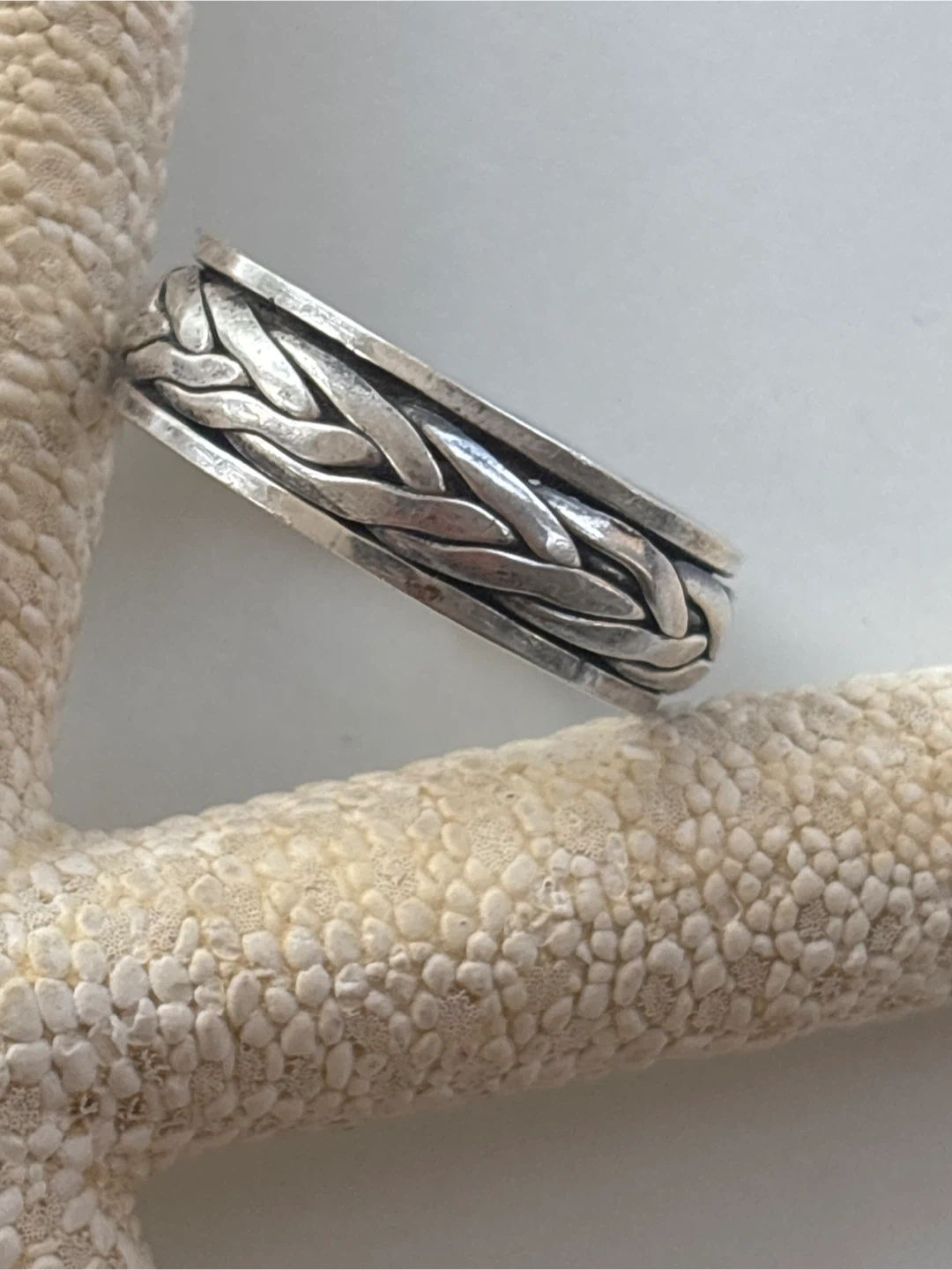 Selling a beautiful sterling silver ring with a braided design. It's marked as 925 sterling silver and is approximately size 7. A lovely piece to add to your collection!