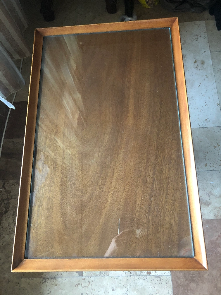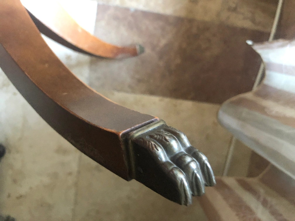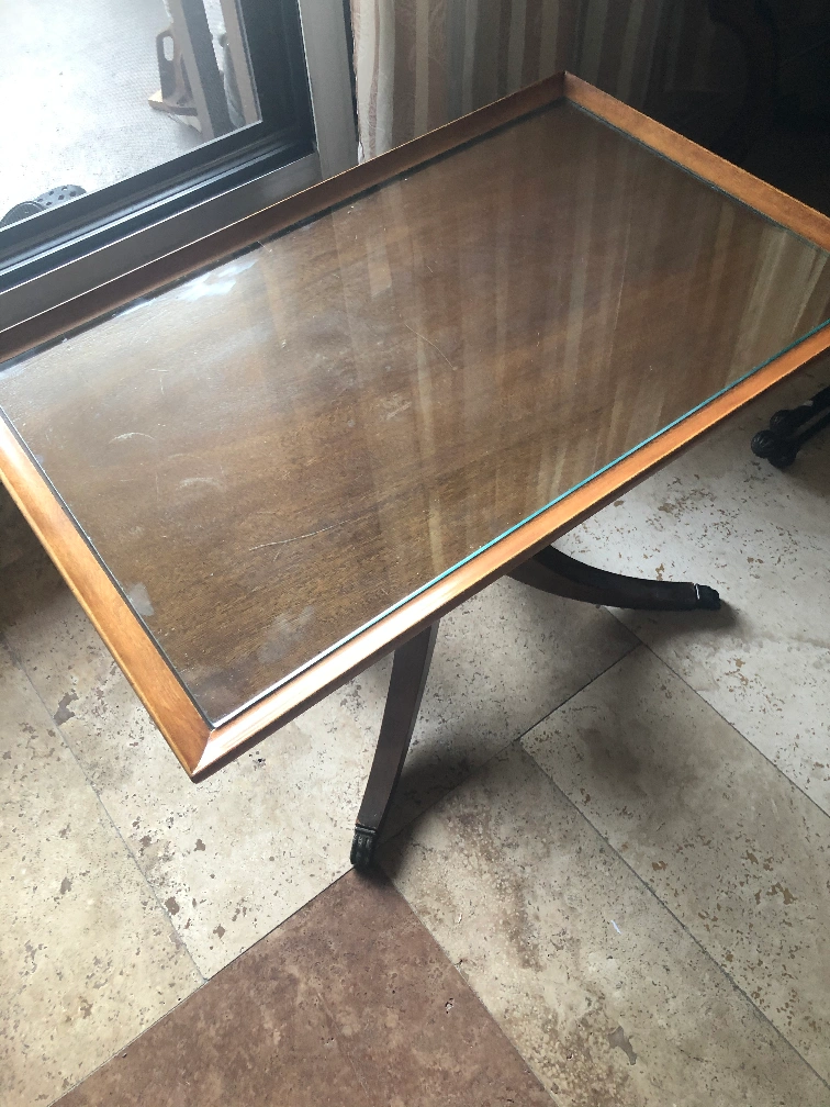 Duncan Phyfe Style Walnut Coffee Table with brass feet made by Deilcraft Fine furniture with plaque of authenticity In great condition with extra glass top H : 17-3/8” L :29-1/4” W:19-1/4”