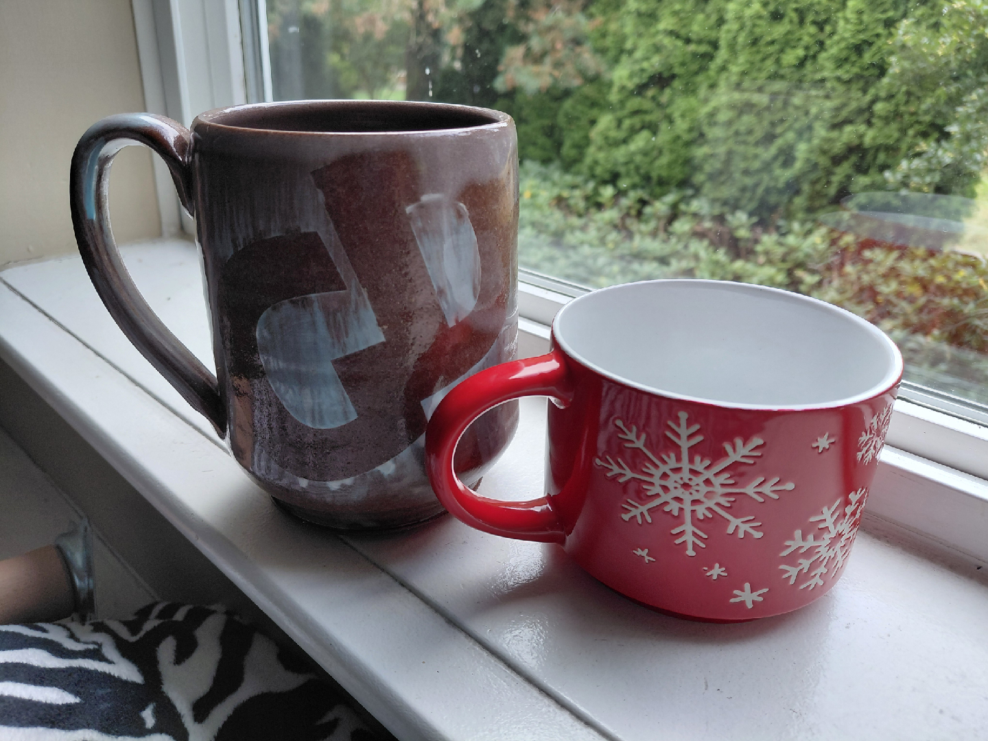 FREE! two decorative coffee mugs. One is a tall brown mug with a unique design, and the other is a red mug with a snowflake pattern. They would be a great addition to your kitchen or a nice gift for someone!