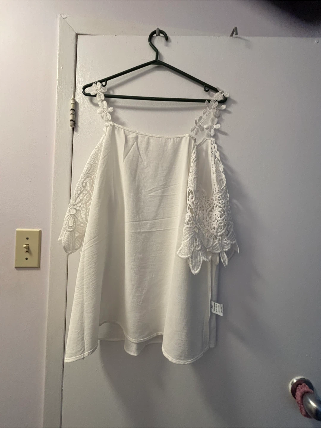 Moving sale! π¨π Sale until September 29. Selling a cute white top with cold shoulder cutouts and lace sleeves. It's in great condition and would be perfect for summer! Tried on once, but itβs too big.