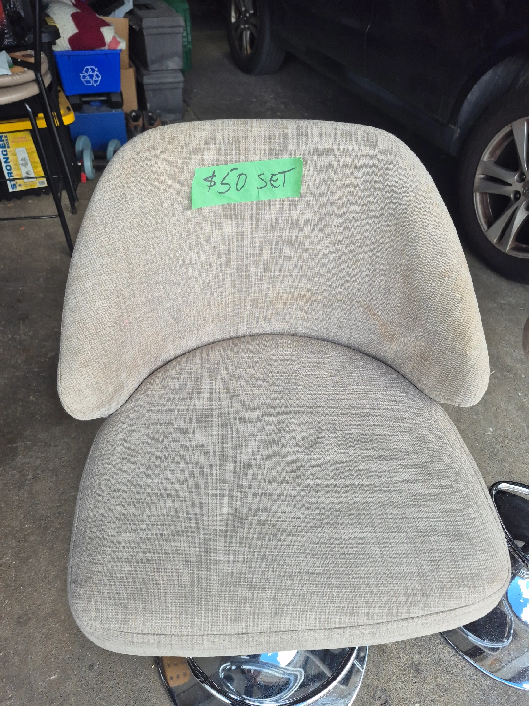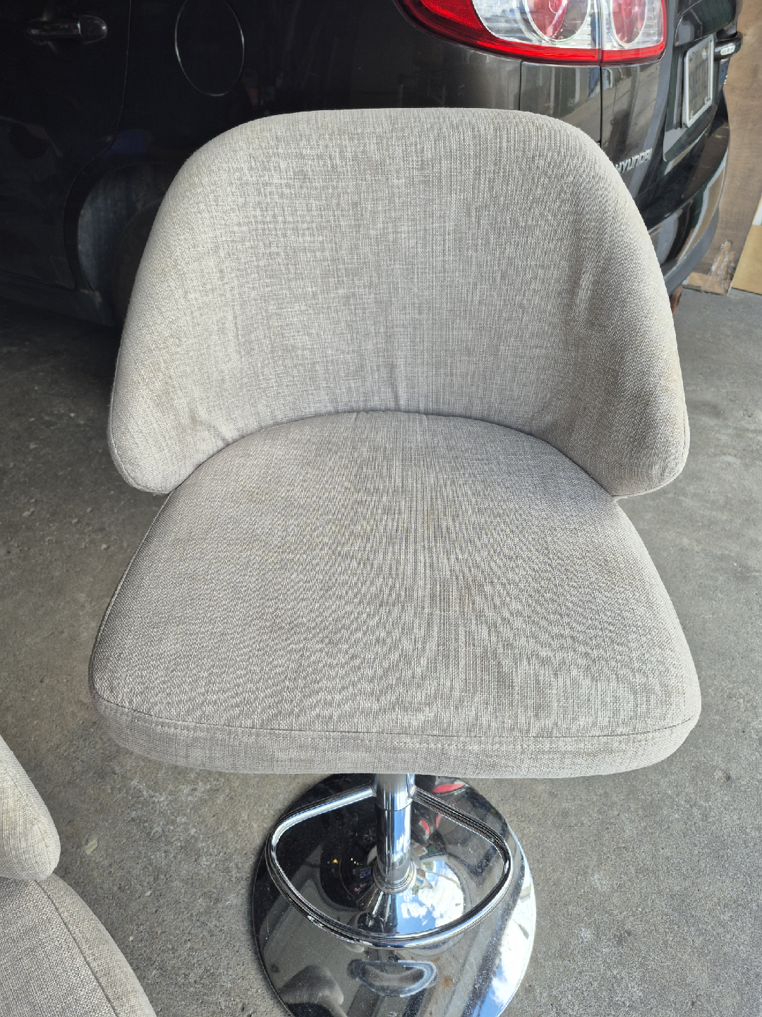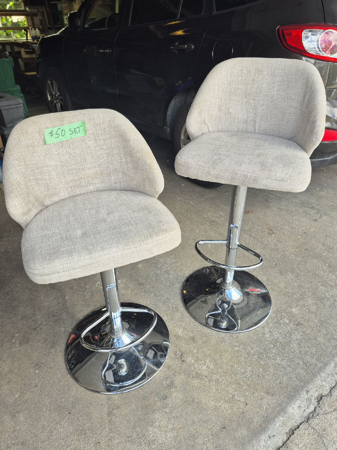 Selling a set of two swivel bar stools. They're in good condition and would look great in any kitchen or bar area. The stools feature a comfortable, curved seat and a sturdy chrome base. A steal at this price!