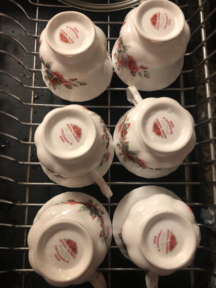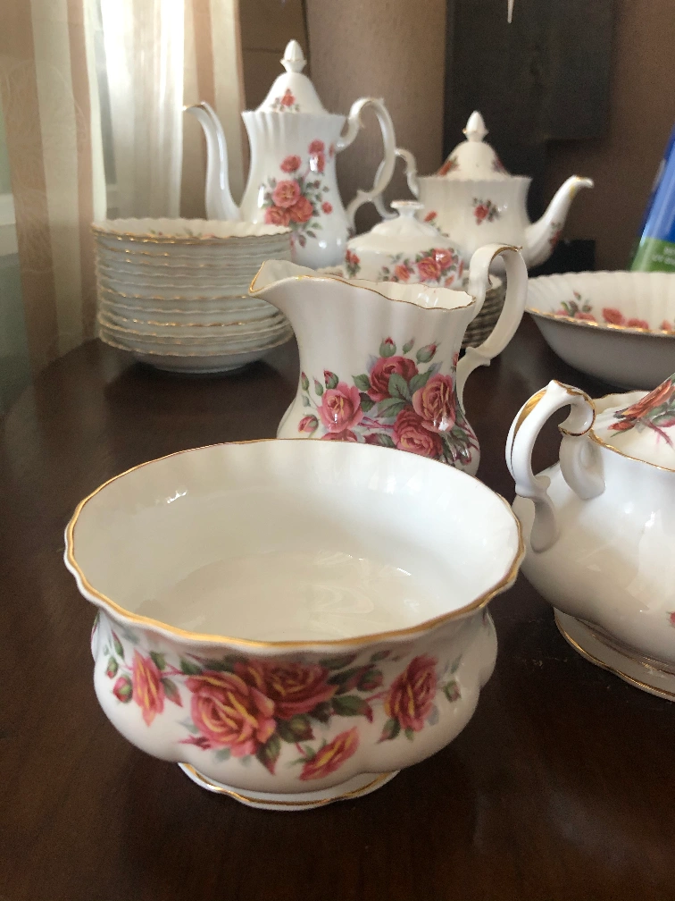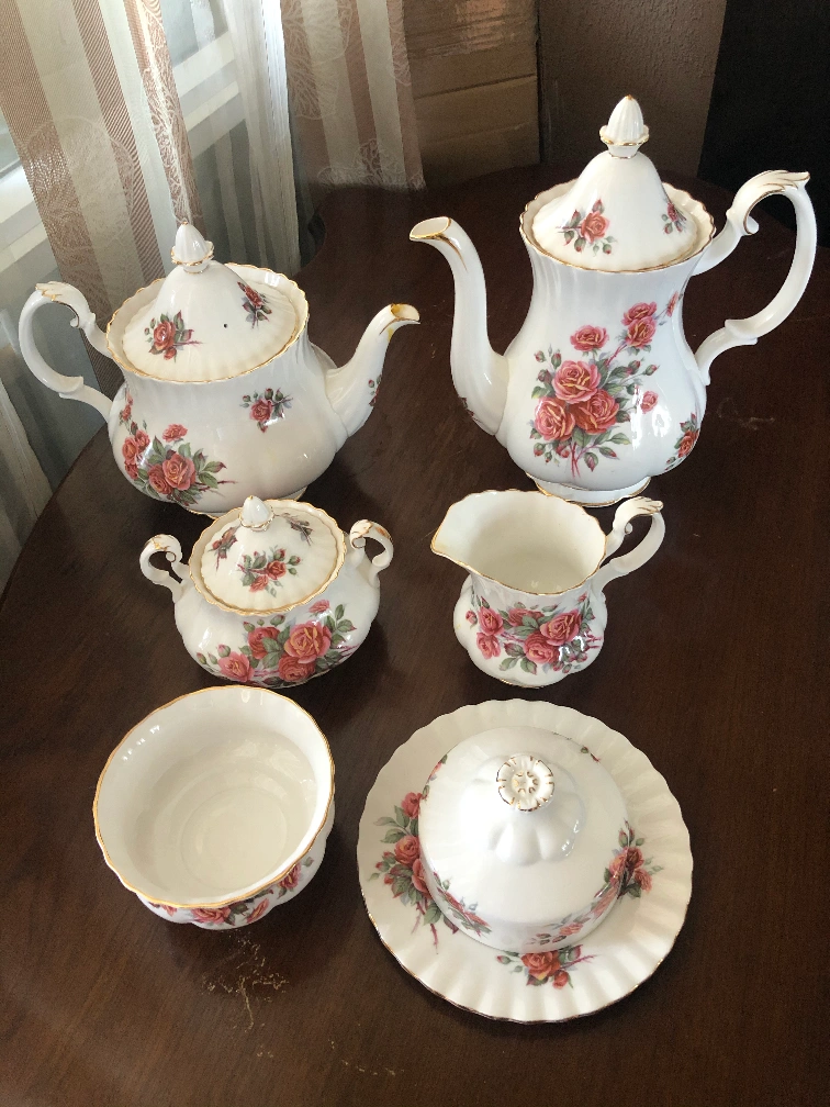 Selling a beautiful Royal Albert Centennial Rose china set. It features a delicate rose pattern with gold trim. Rare 1980’s Royal Albert Cenntenial Tea Coffee set Coffee pot, Tea pot (small chip), 9-1/2” serving bowl , butter dish, sugar bowl , creamer, 4-1/2” deep candy dish . 10 cups, 12 saucers , 8 bread and butter plates (6 - 1/2”) 41 pieces altogether