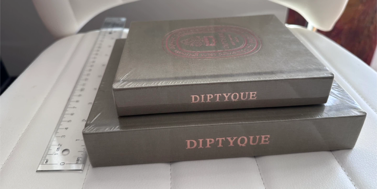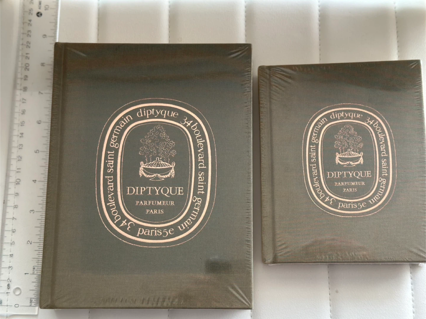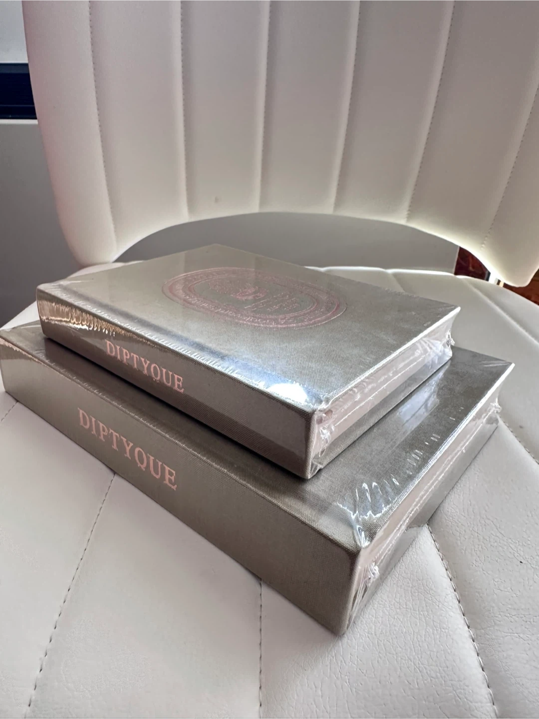 2 Diptyque faux books /blank pages for coffee table display still sealed in cellophane .
