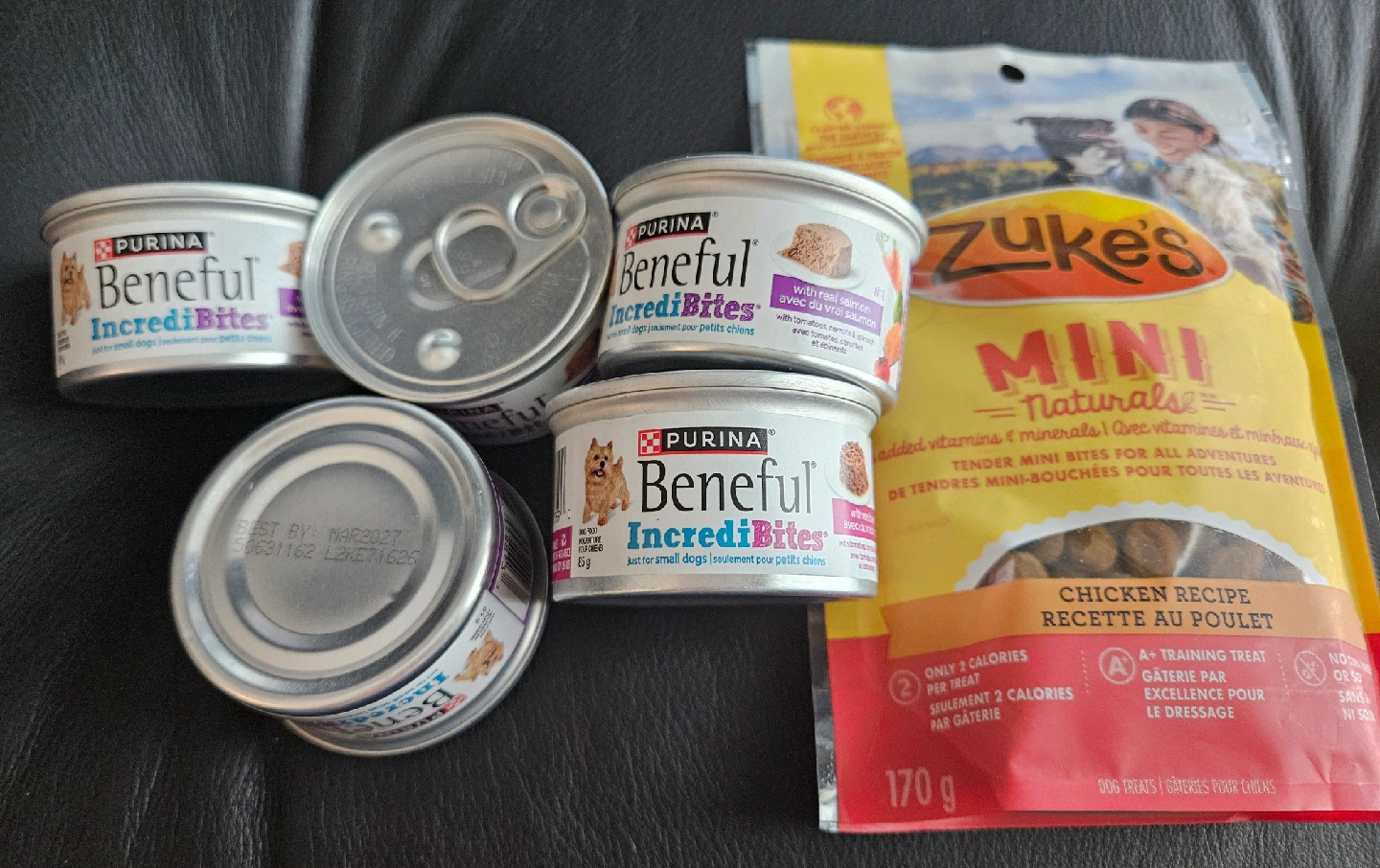 Brand New 5 cans of 85g Purina Beneful IncrediBites and a bag of Zuke's Mini Naturals.