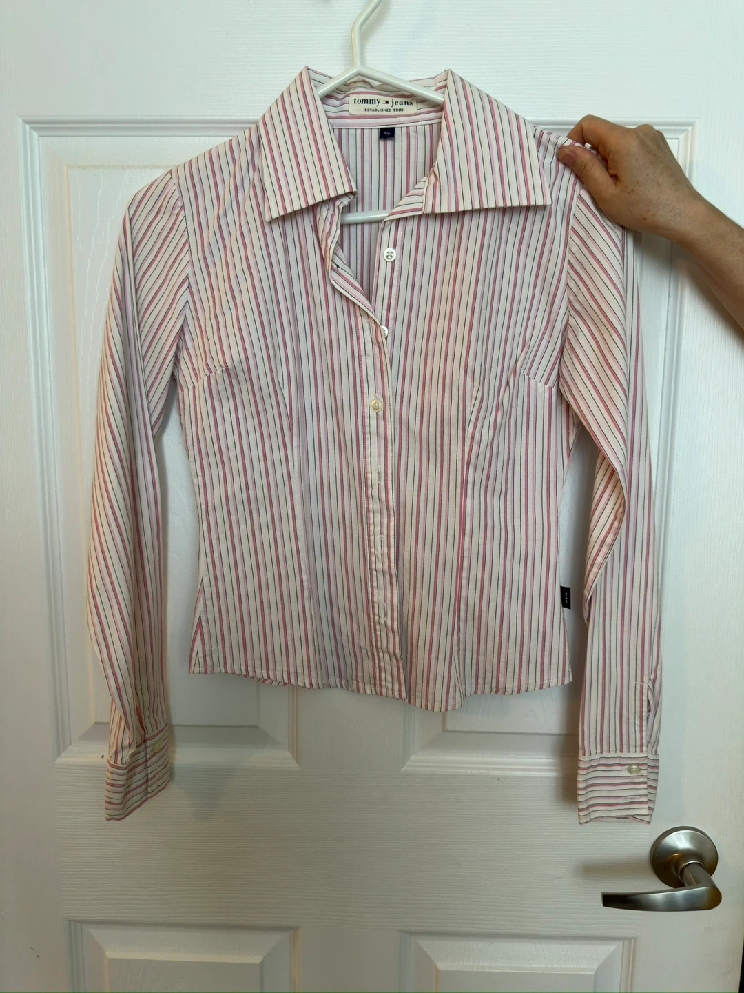 Tommy Jeans long-sleeve blouse up for grabs! It's a size small and features a stylish striped pattern. Perfect for adding a touch of casual chic to your wardrobe!