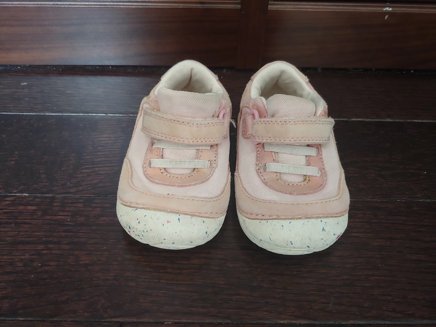 These adorable Stride Rite toddler shoes are in good clean condition. They're a soft pink colour and size 5 (true sizing). Stride rites are one of the recommended first walking shoes for babies. Washed and have lots of ware left.
