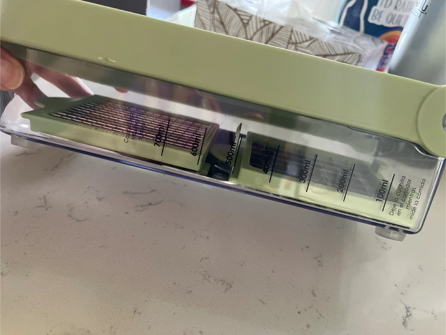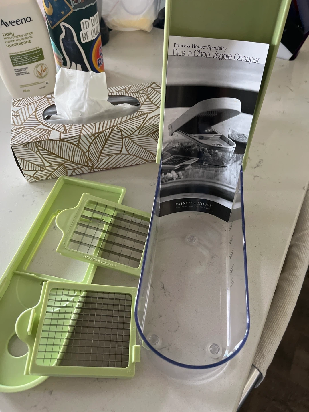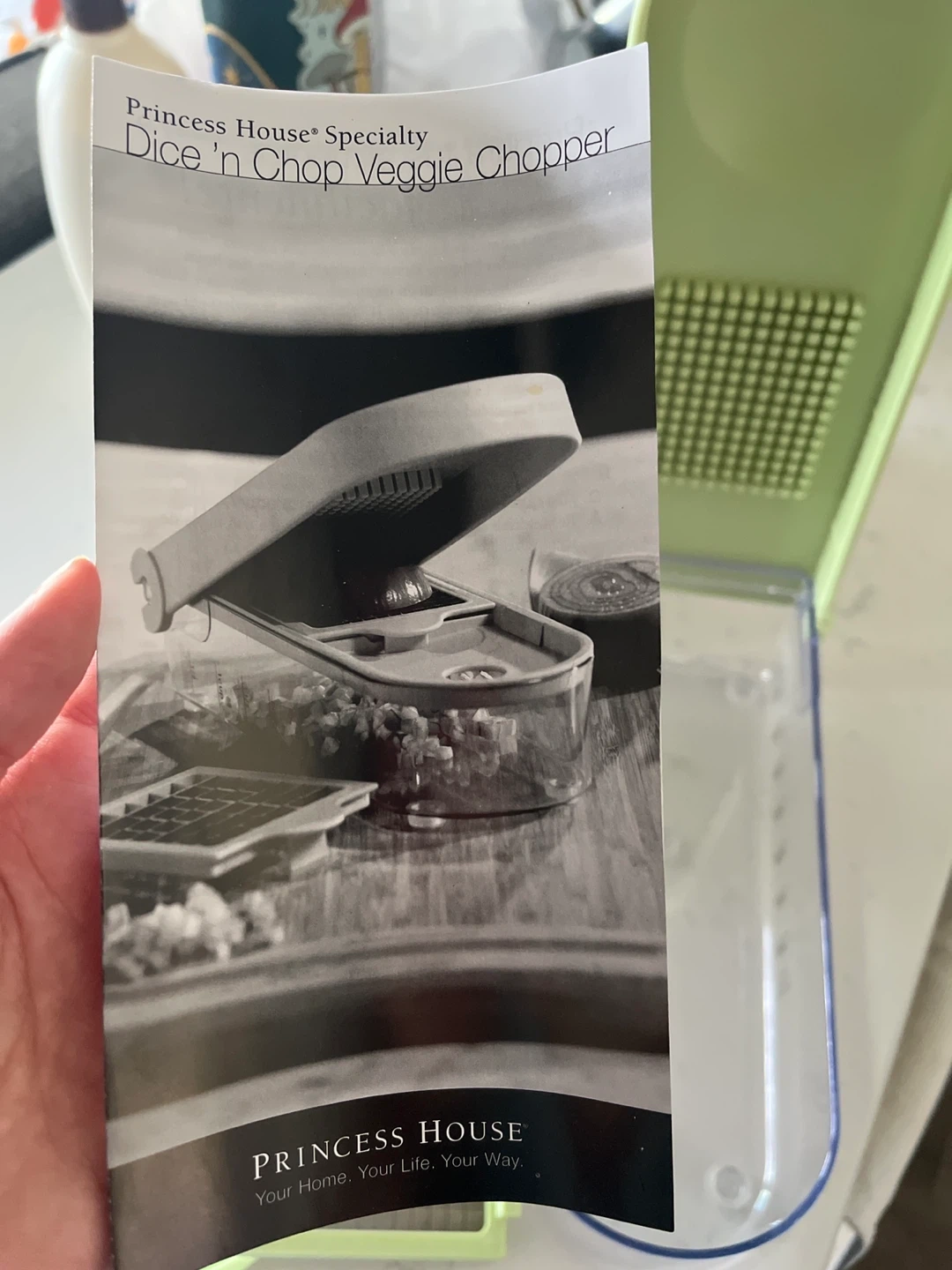 Princess House Specialty Dice 'n Chop Veggie Chopper to make food prep a breeze! It comes with two blades for different cuts and a container to catch all your chopped veggies. It also has measurement markings on the side of the container. Little cleaner brush included. Not in original packaging, once used.