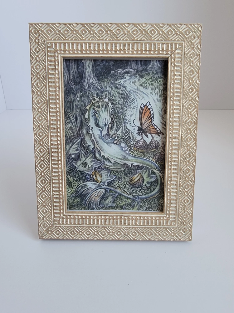 Here's a cute decorative picture frame with dragon art! It's in great condition and ready to display your favourite photo or artwork. The frame has a unique textured design, adding a touch of charm to any room.