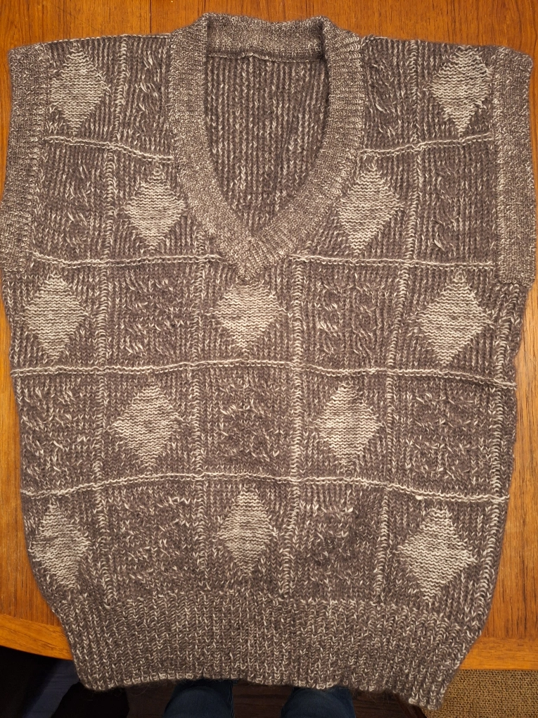 Cozy knitted vest with a brown and white diamond pattern. Perfect for layering!