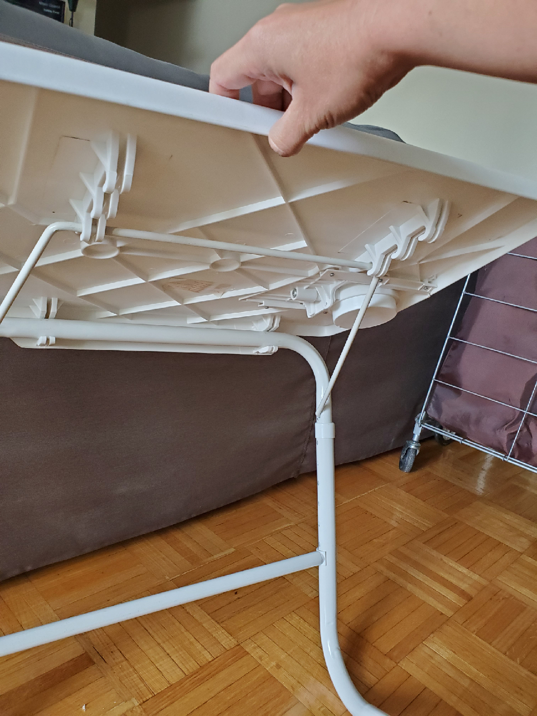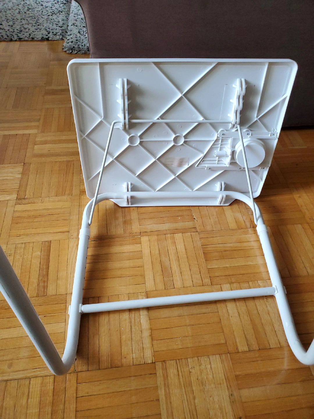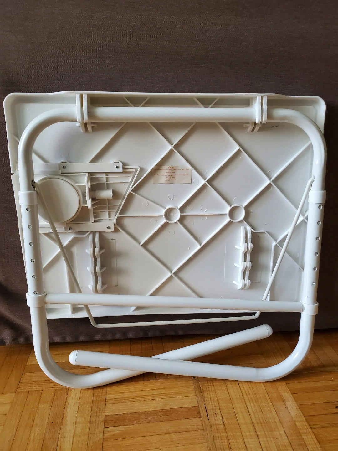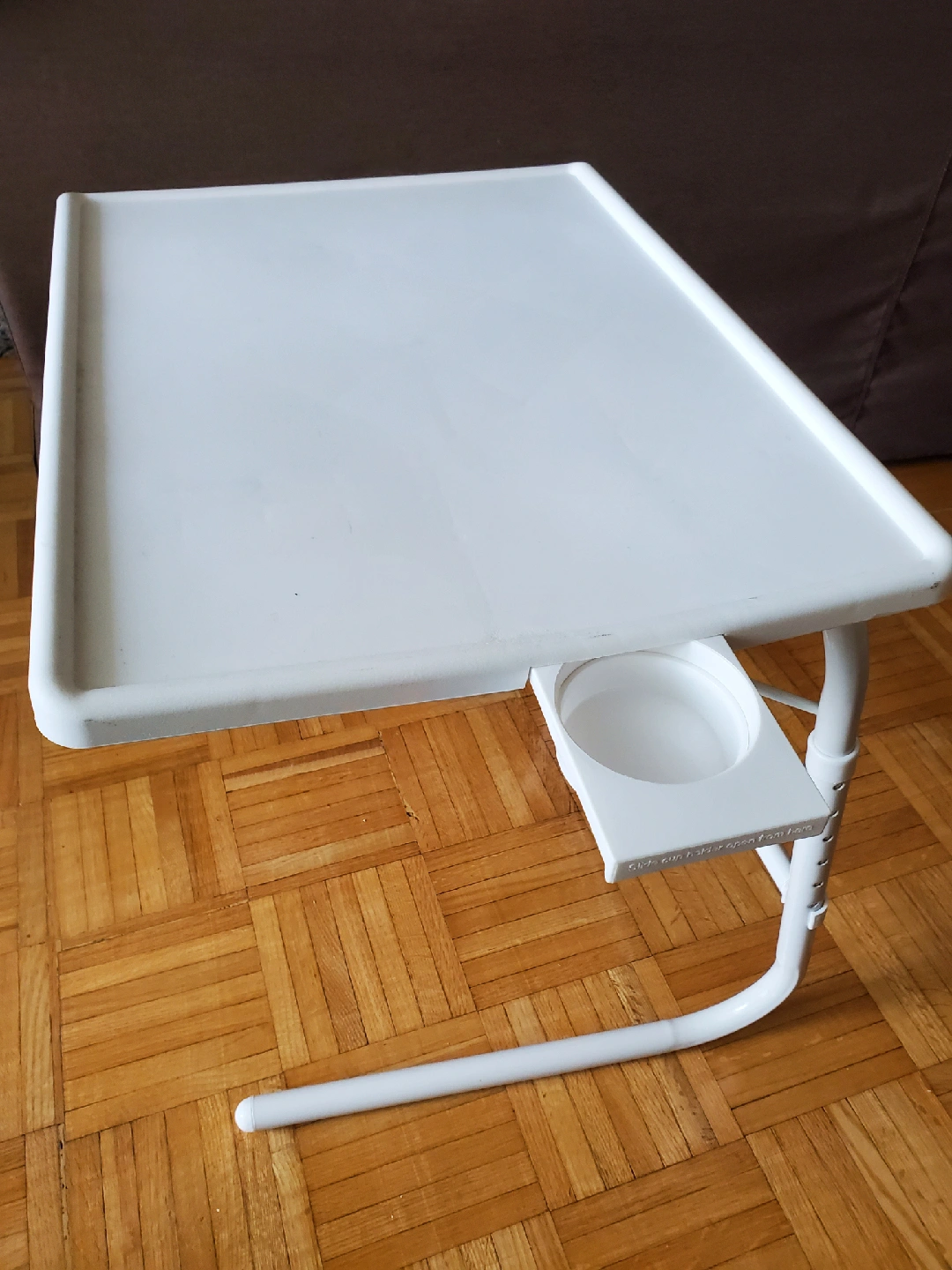 Selling a handy white tray table! It's adjustable, and lightweight. It also has a convenient cup holder. Great for small spaces and easy to store when not in use.