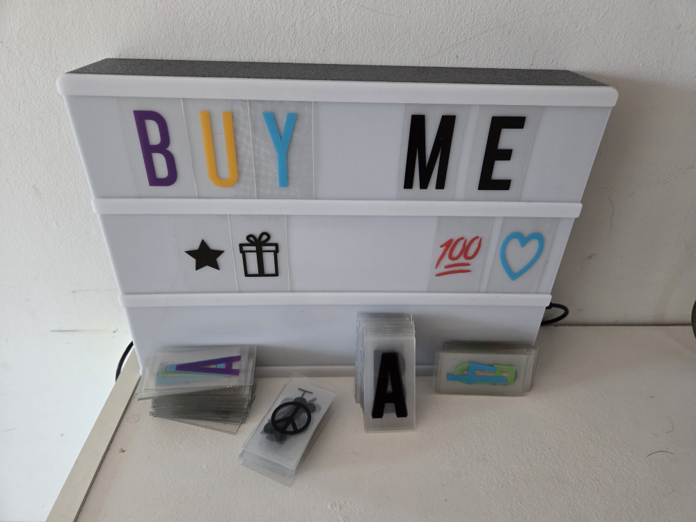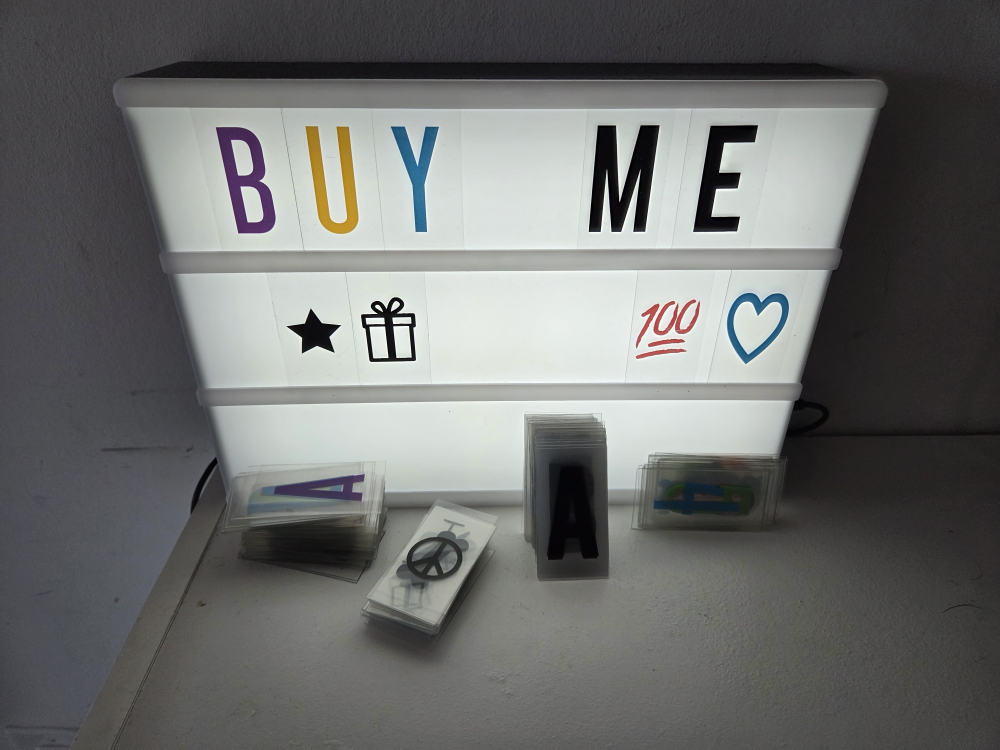 Super fun little lamp! Got the letters and symbols sets in black and white and in color; I got them separately but selling them together (all was around $35). Works with charger (not included), USB connection, so no batteries needed!