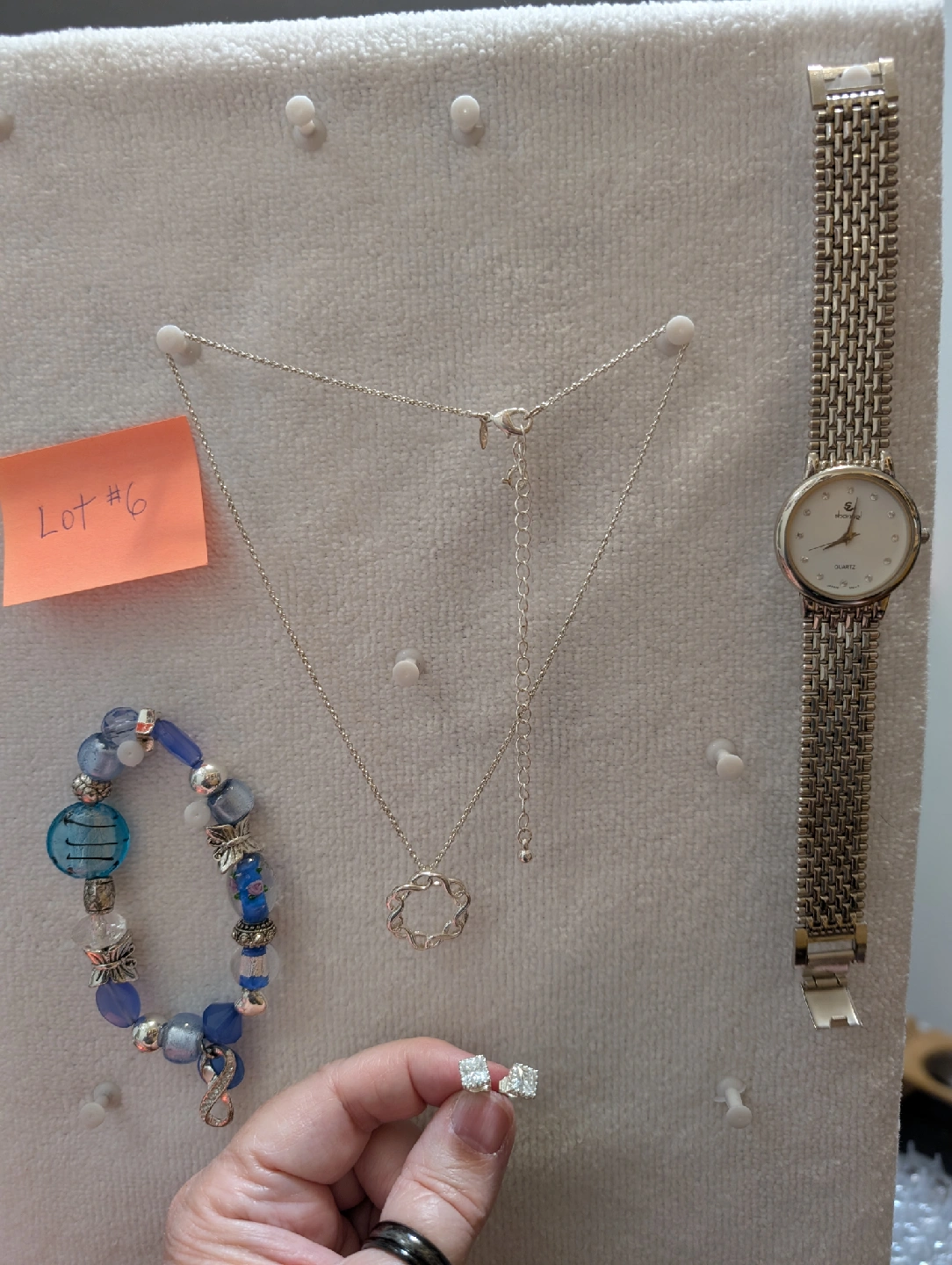 Selling a silver/sparkly jewellery lot including a beaded blue bracelet with infinity charm, a silver tone necklace, a pair of square stud rhinestone earrings and silver tone watch. The watch will need a new battery. It doesn't appear that the watch has ever been worn. All in great condition. Lot #6. All for $5. Pick up ONLY in Beltline neighbourhood (near corner of 15 Ave SW and 14 St SW). FCFS. Cash only. I'm flexible with pick up times but please don't no-show. Also please check out my other listings. Thanks.