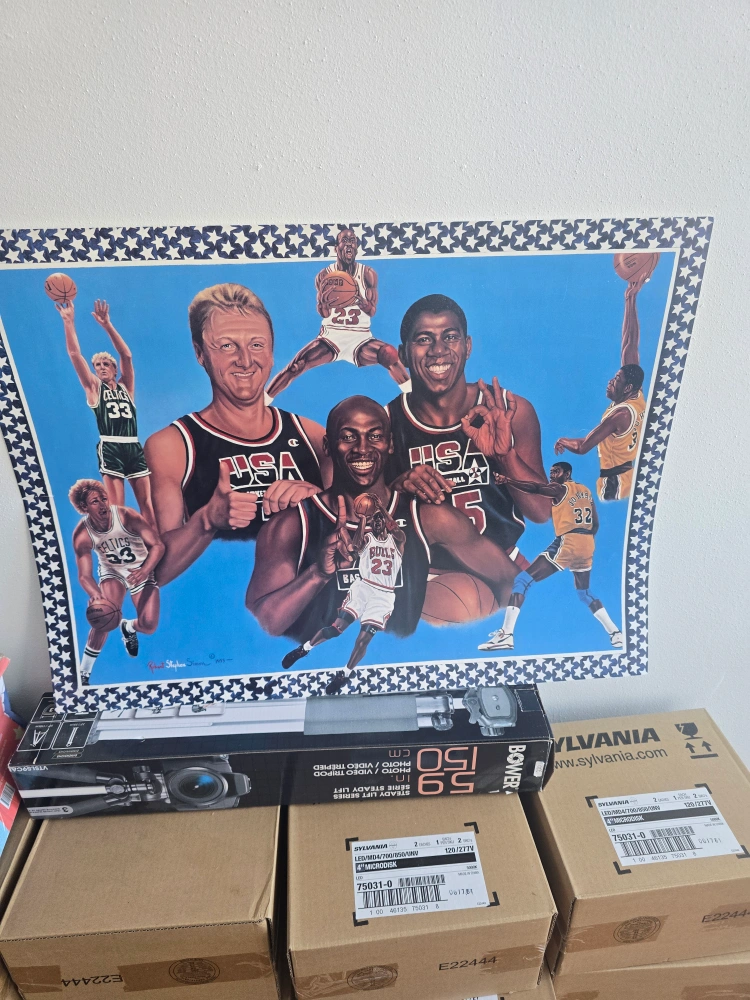 Selling a vintage poster featuring Michael Jordan, Larry Bird, and Magic Johnson. It measures approximately 24 inches by 28 inches. A great piece for any basketball fan!