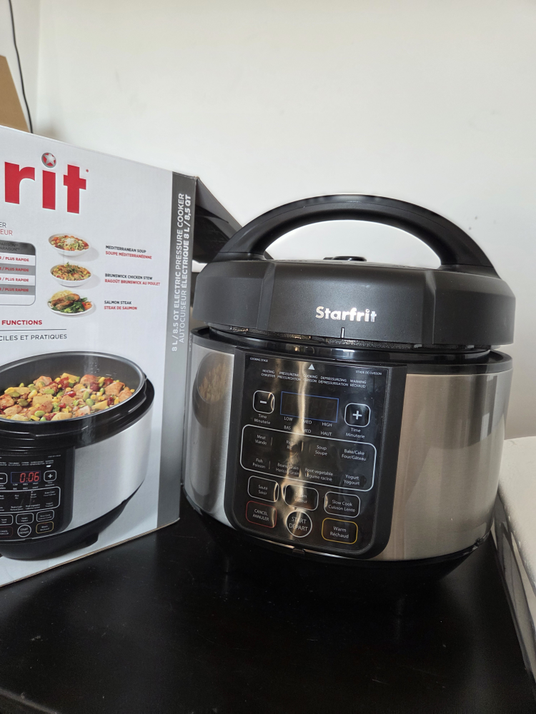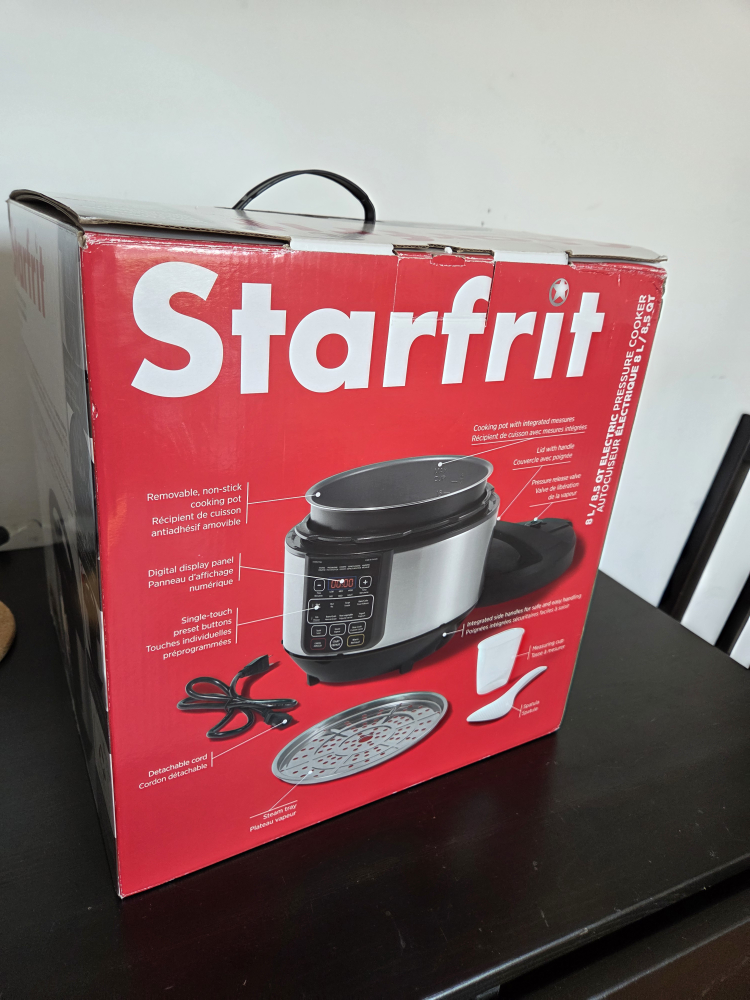 Selling a Starfrit electric pressure cooker! Almost new, used twice. It's an 8L/8.5 QT size and comes in its original box with almost all components included (no steam tray). Perfect for quick and easy meals.
