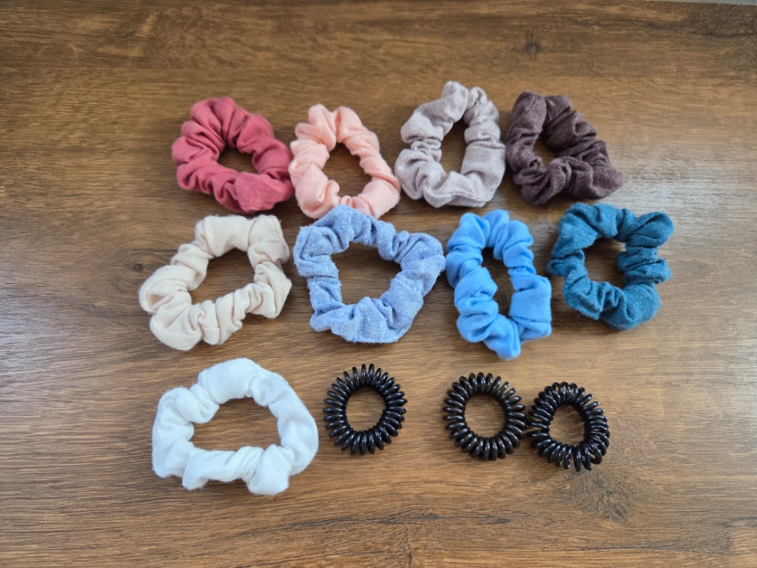 Selling a mixed lot of scrunchies in various colours and a couple of black hair coils. Tried using them but I have too much hair. These have gone through a washing cycle :)