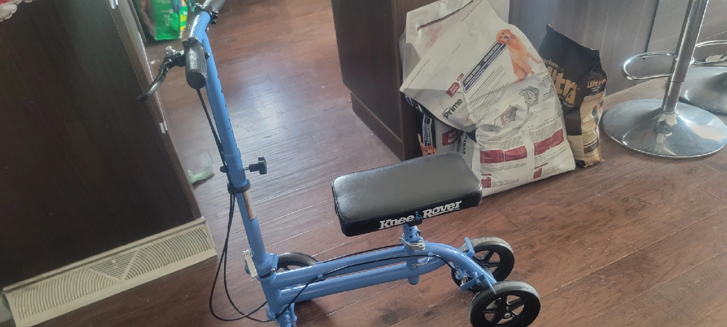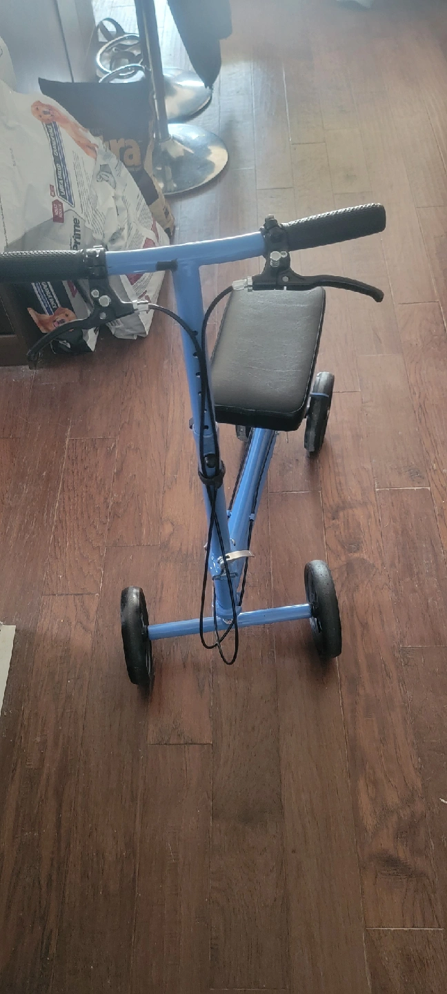 Knee Rover scooter in good condition. powder blue in colour with adjustable height handlebars and easy to use bike-style breaks. Used for an injury and was a million times better than crutches.