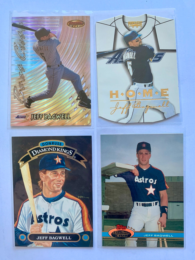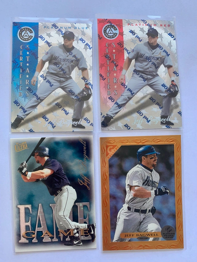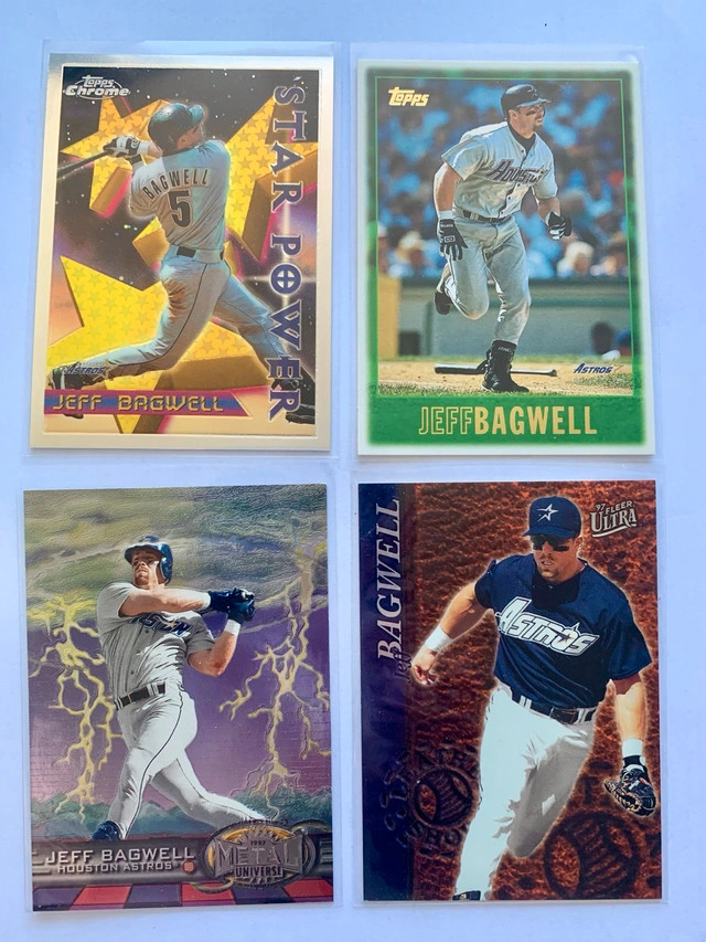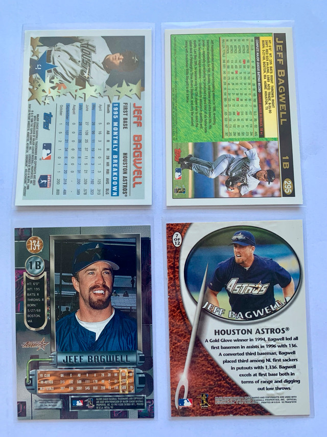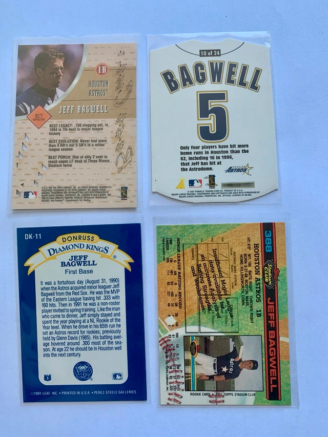 Selling a collection of 16 Jeff Bagwell baseball cards, including one refractor card, perfect for any sports memorabilia collector! These used cards showcase Bagwell's career with the Houston Astros and are in good condition, ready to be added to your collection. Bagwell was inducted into the Baseball Hall of Fame in 2017. Cards showcase Jeff Bagwell and the Houston Astros. Let me know if you're interested!