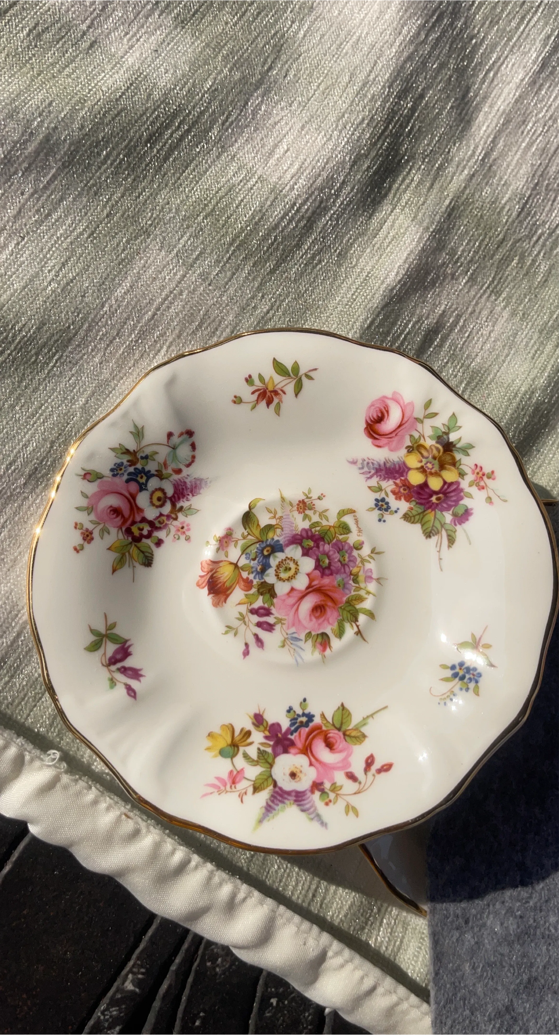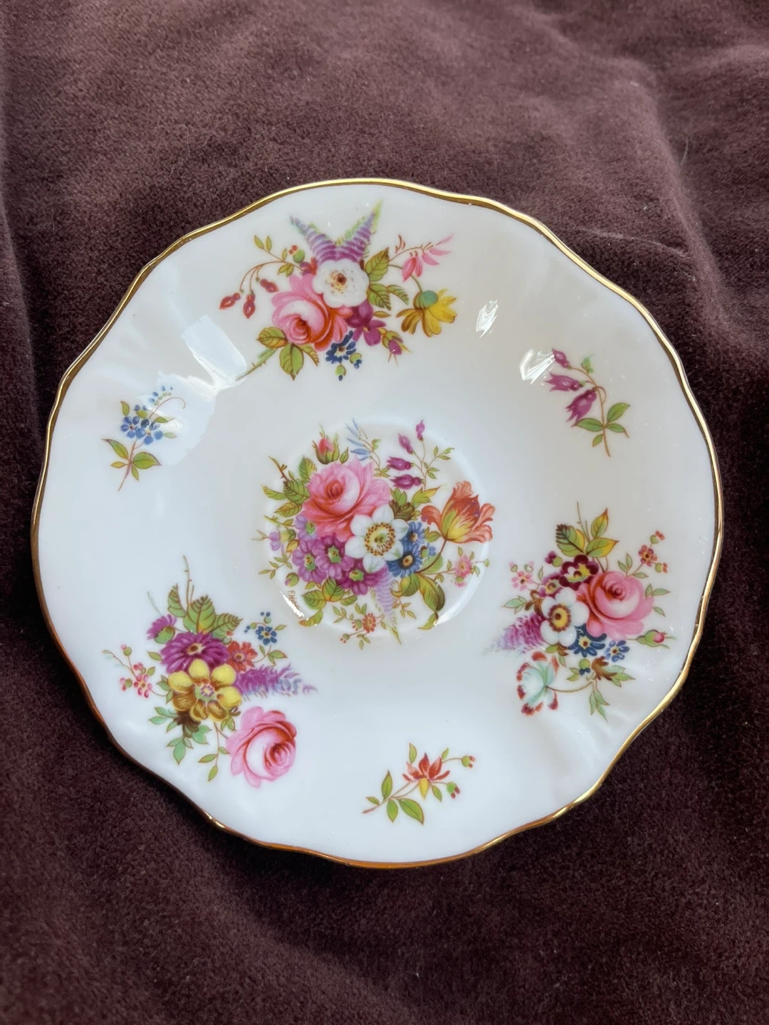 Selling a lovely Hammersley Fine Bone China saucer. It has a beautiful floral design with a gold trim. Made in England, this delicate piece would be a great addition to any tea set or collection!