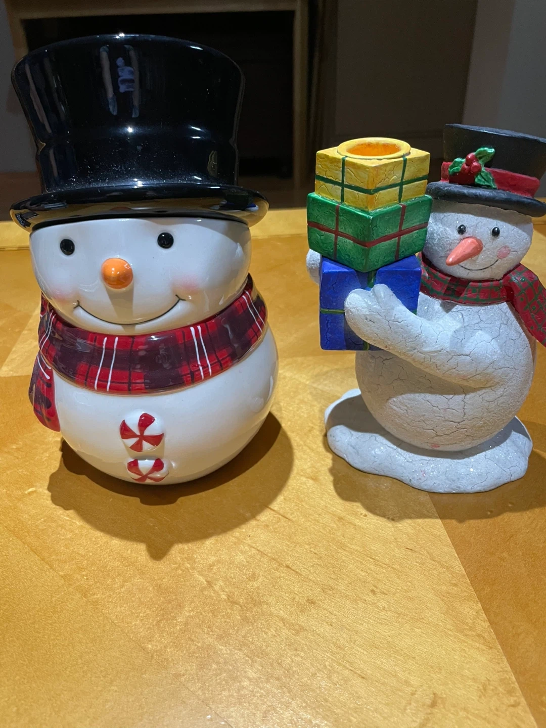 Add some holiday cheer to your home with these adorable snowman figurines! One is a jar with a lid, perfect for storing treats, and the other is holding a stack of presents. They're great for decorating your mantel or adding a touch of whimsy to any room during the festive season