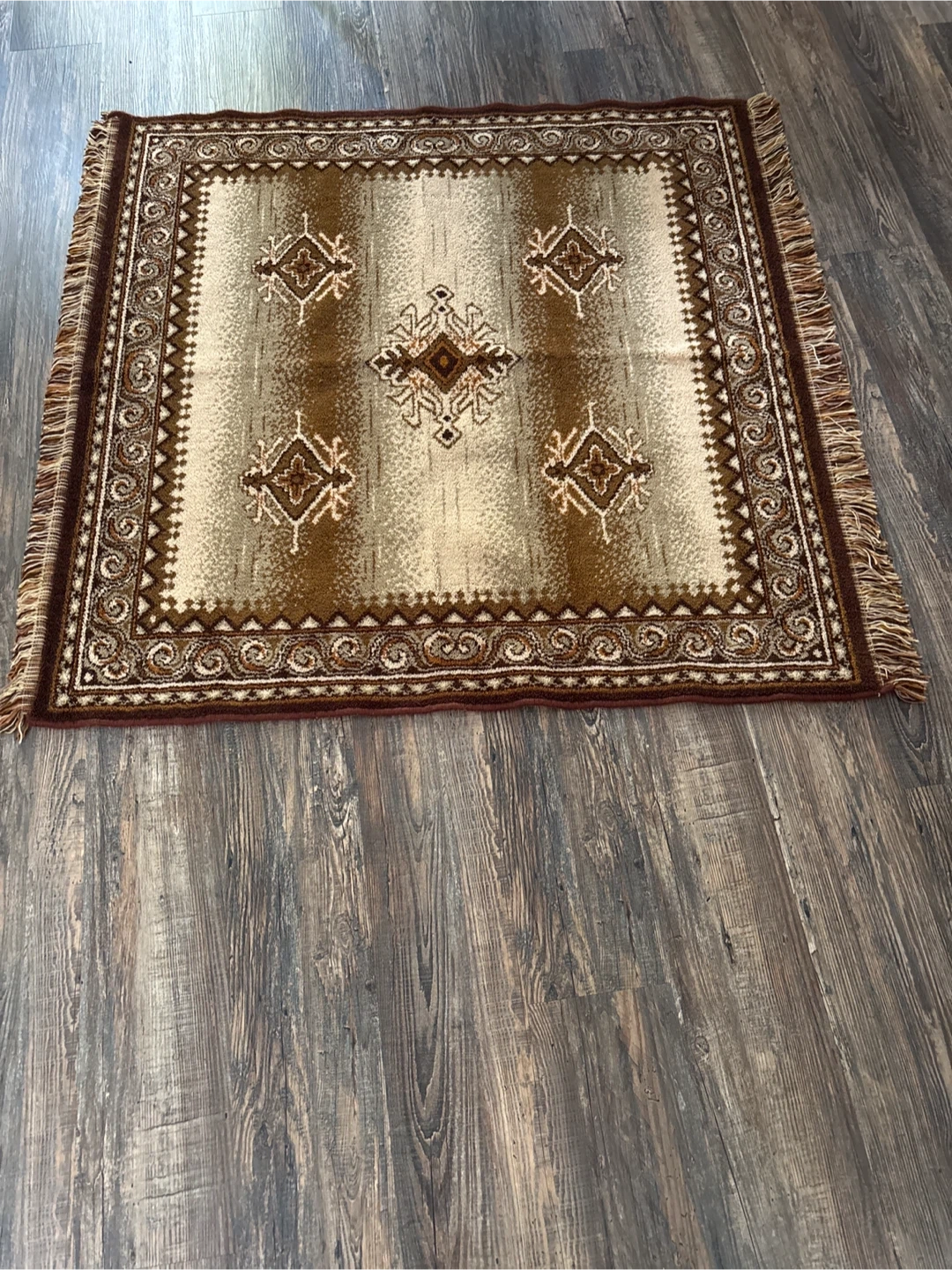 Selling a vintage rug with a unique brown and beige patterned design. It's a great piece to add some character to your space. The rug has a decorative border and fringe. Perfect for adding a cozy touch to any room!