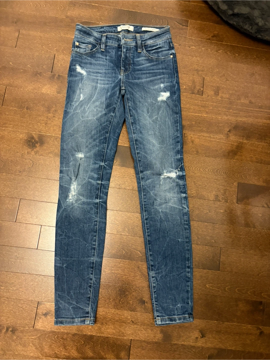 Selling a pair of Guess Mid Rise Skinny jeans in size 24. They're in good condition and have a stylish, distressed look with some rips. Perfect for a casual outfit!