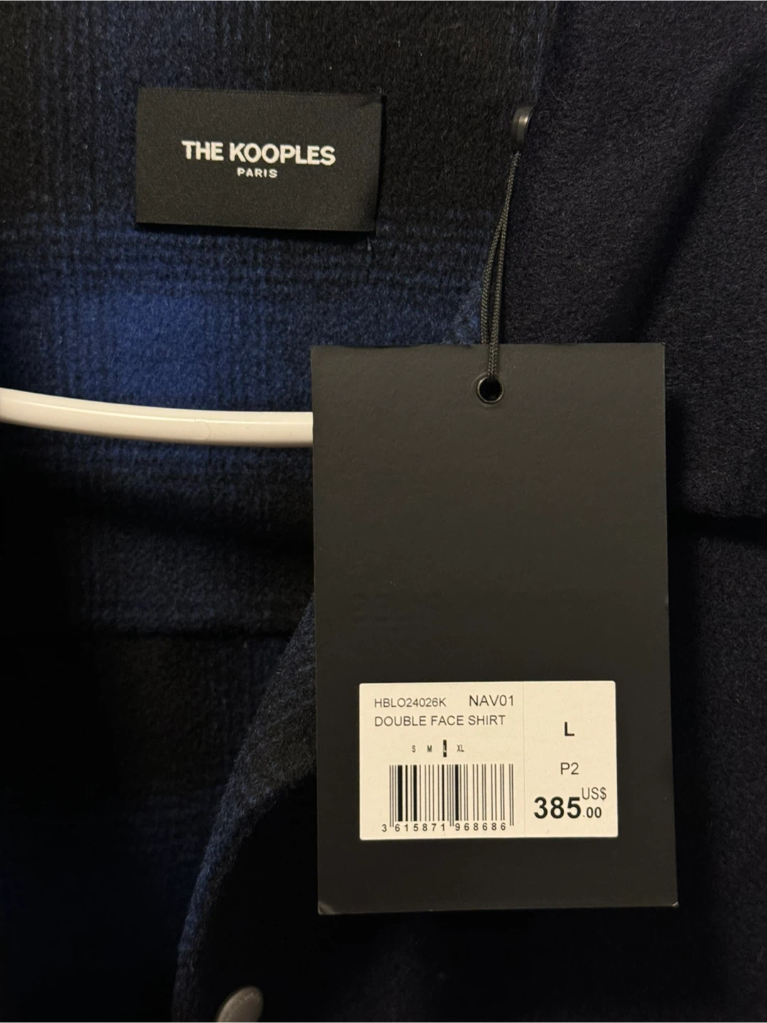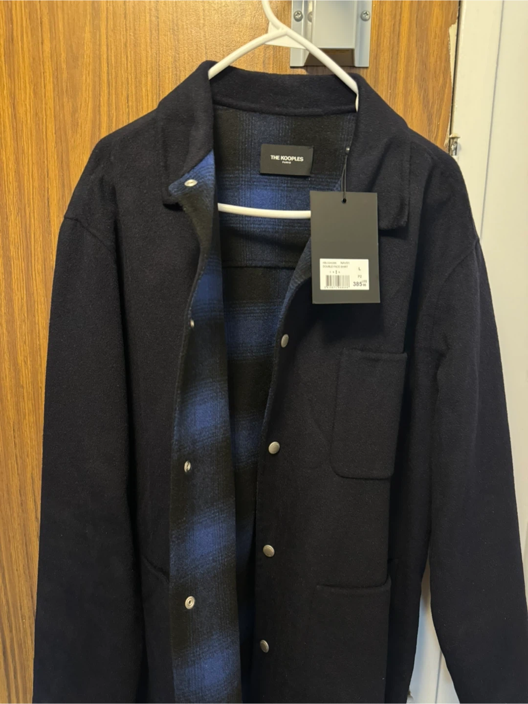 Selling a The Kooples overshirt jacket. Originally ~530 USD before tax. The jacket features a blue and black plaid lining for reverse style wearing. Brand new with tag. Size L.