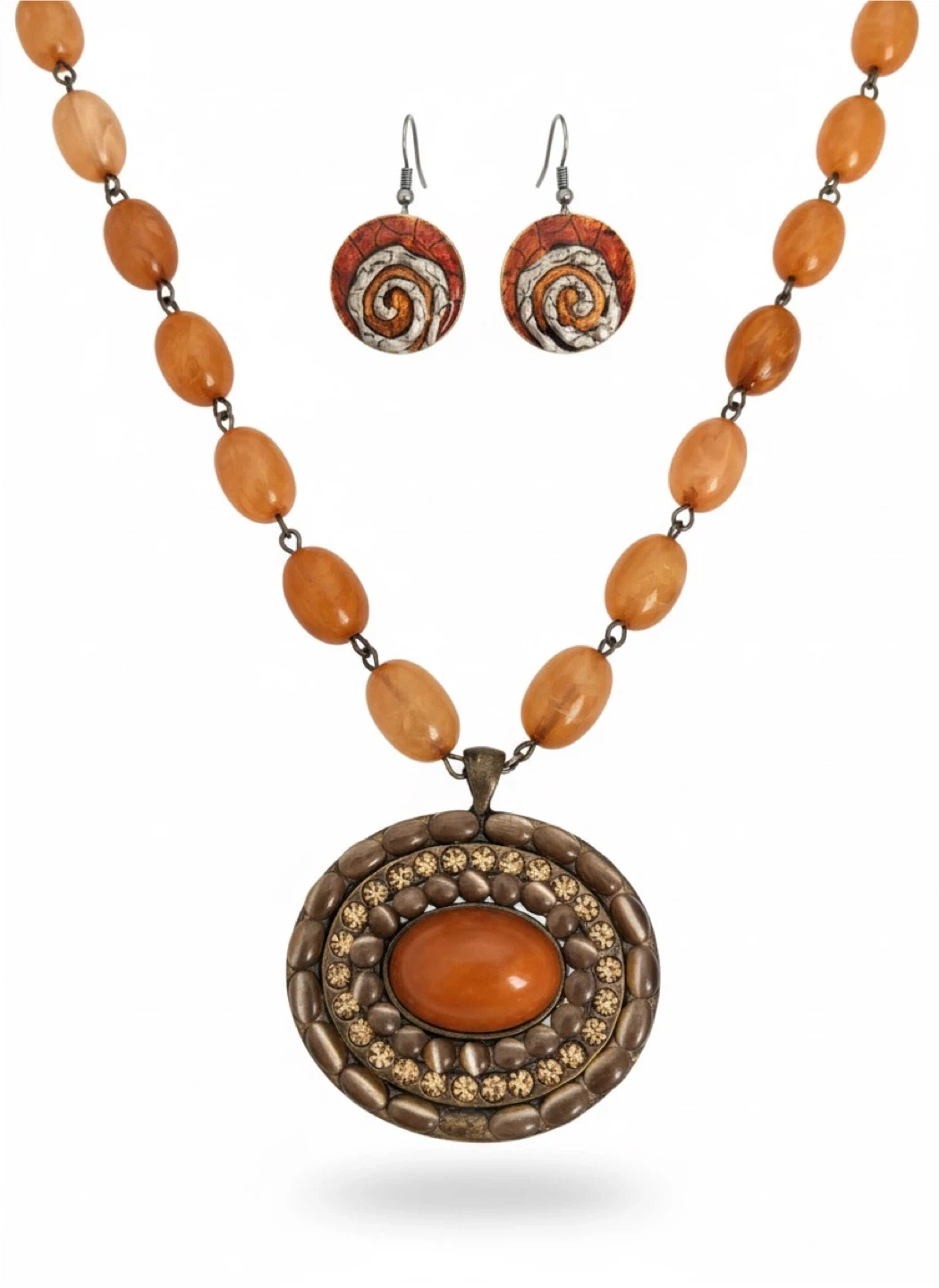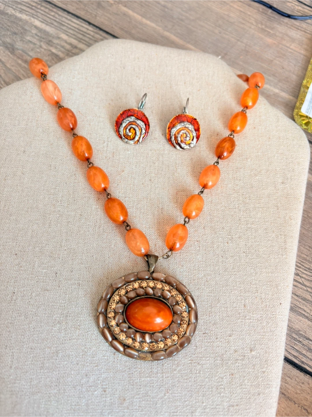 Here's a lovely orange beaded necklace and earring set! The necklace features a large oval pendant and matching earrings. It's in great condition and ready to add a pop of colour to your outfit , 16 inches chain comes with boxes #HandmadeJewelry #MinimalJewelry #StatementJewelry #BohoJewelry #LuxuryJewelry #GoldJewelry #SilverJewelry #GemstoneJewelry #silver #neckless