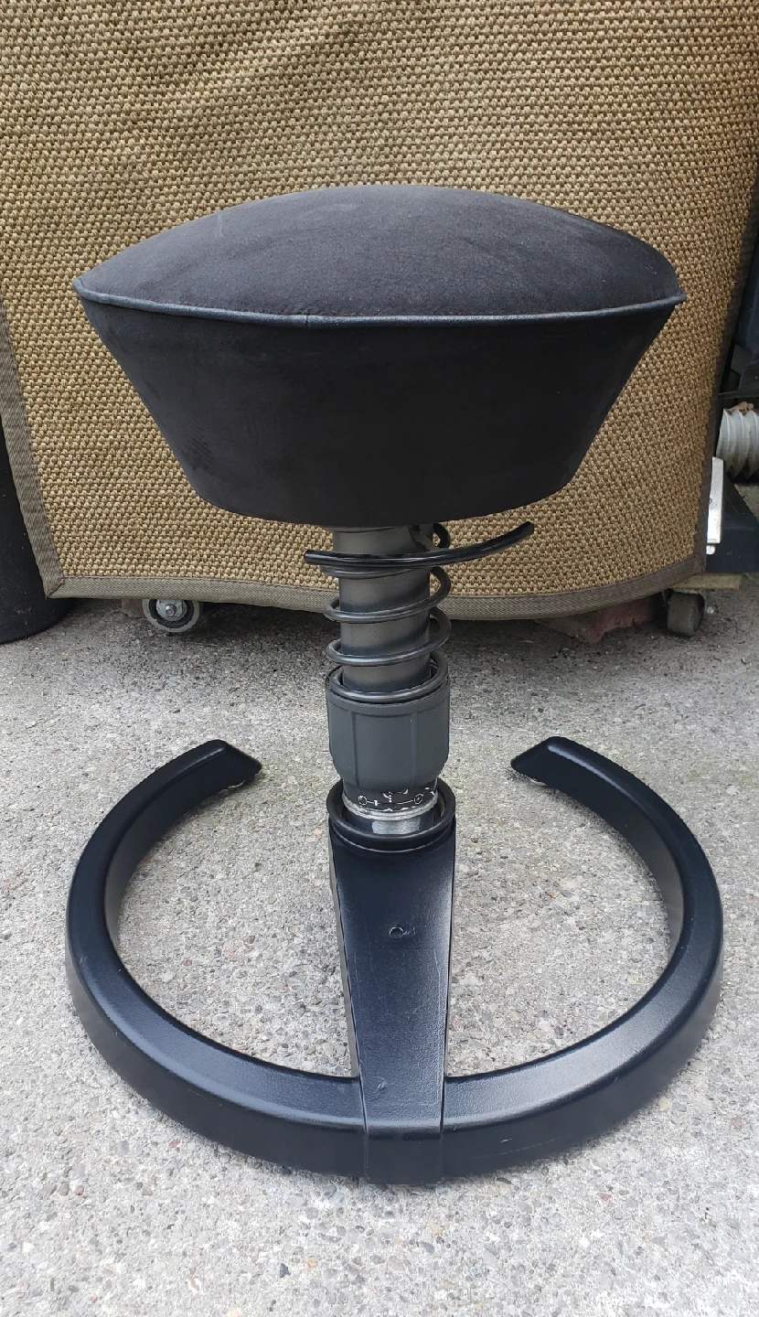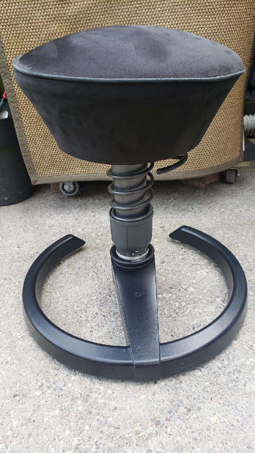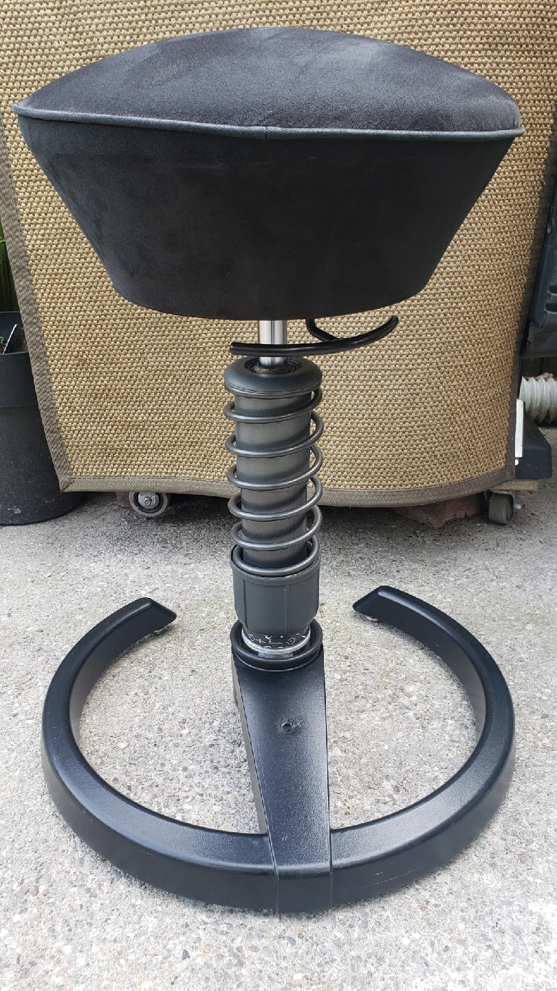The stool's unique technology allows for movement in all directions (forward, back, sideways, and up and down), promoting an active sitting posture.