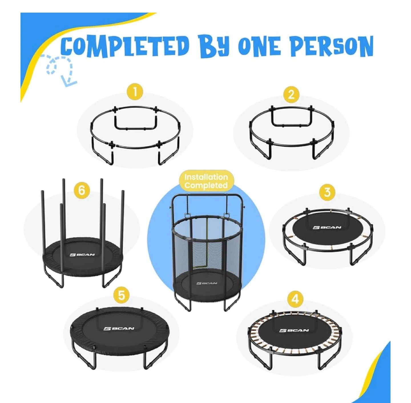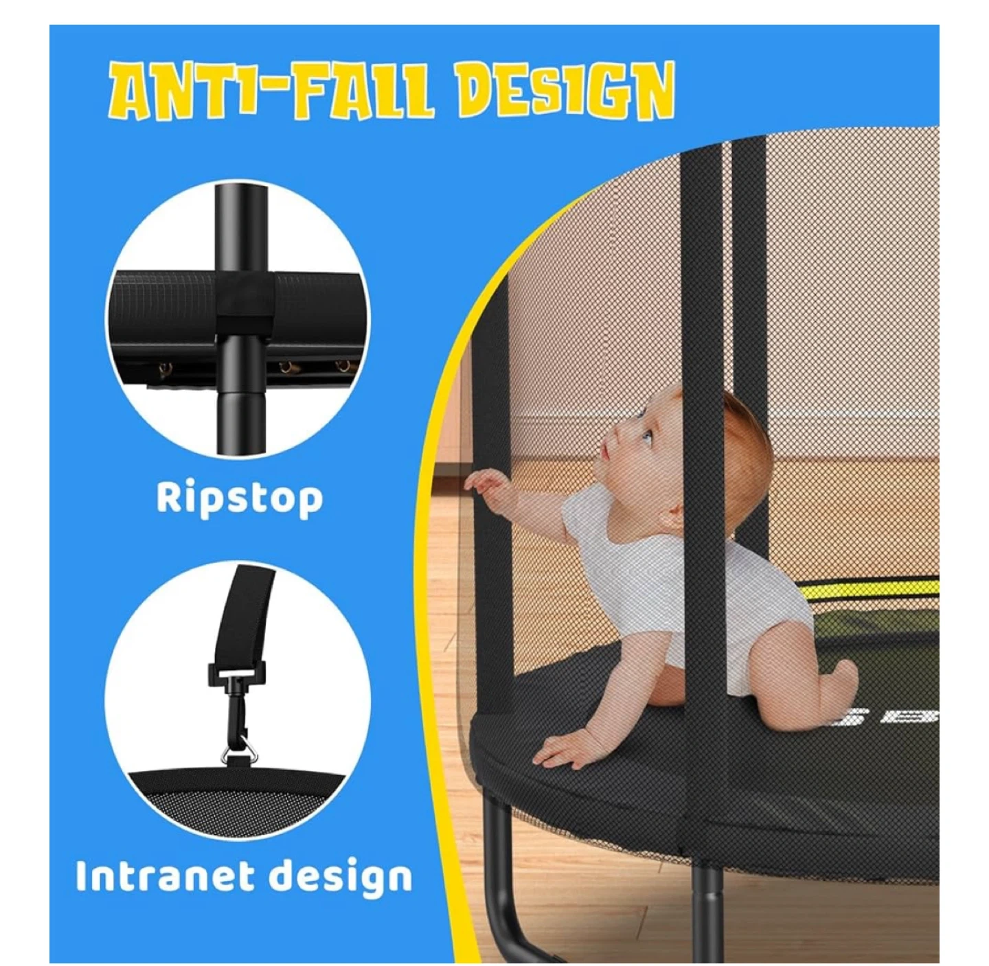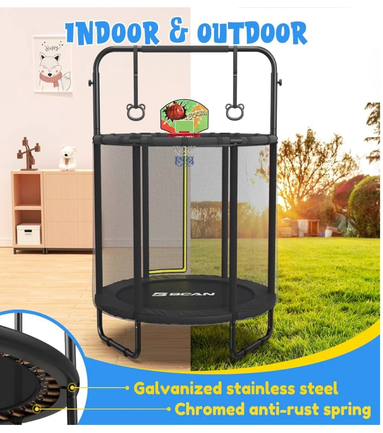 This GECAN trampoline is great for indoor or outdoor fun! It features a galvanized stainless steel frame and chromed anti-rust springs. The anti-fall design includes ripstop netting and an intranet design for added safety.