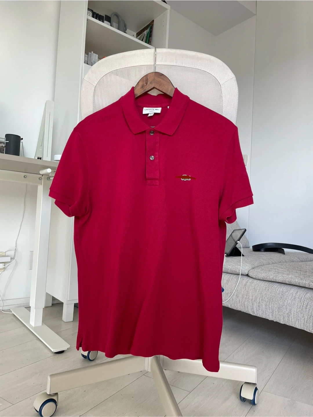 Worn once A classic red Lacoste polo shirt! Perfect for a casual day out or dressing up a bit. The iconic Lacoste logo is subtly embroidered on the chest. In great condition and ready for a new home!