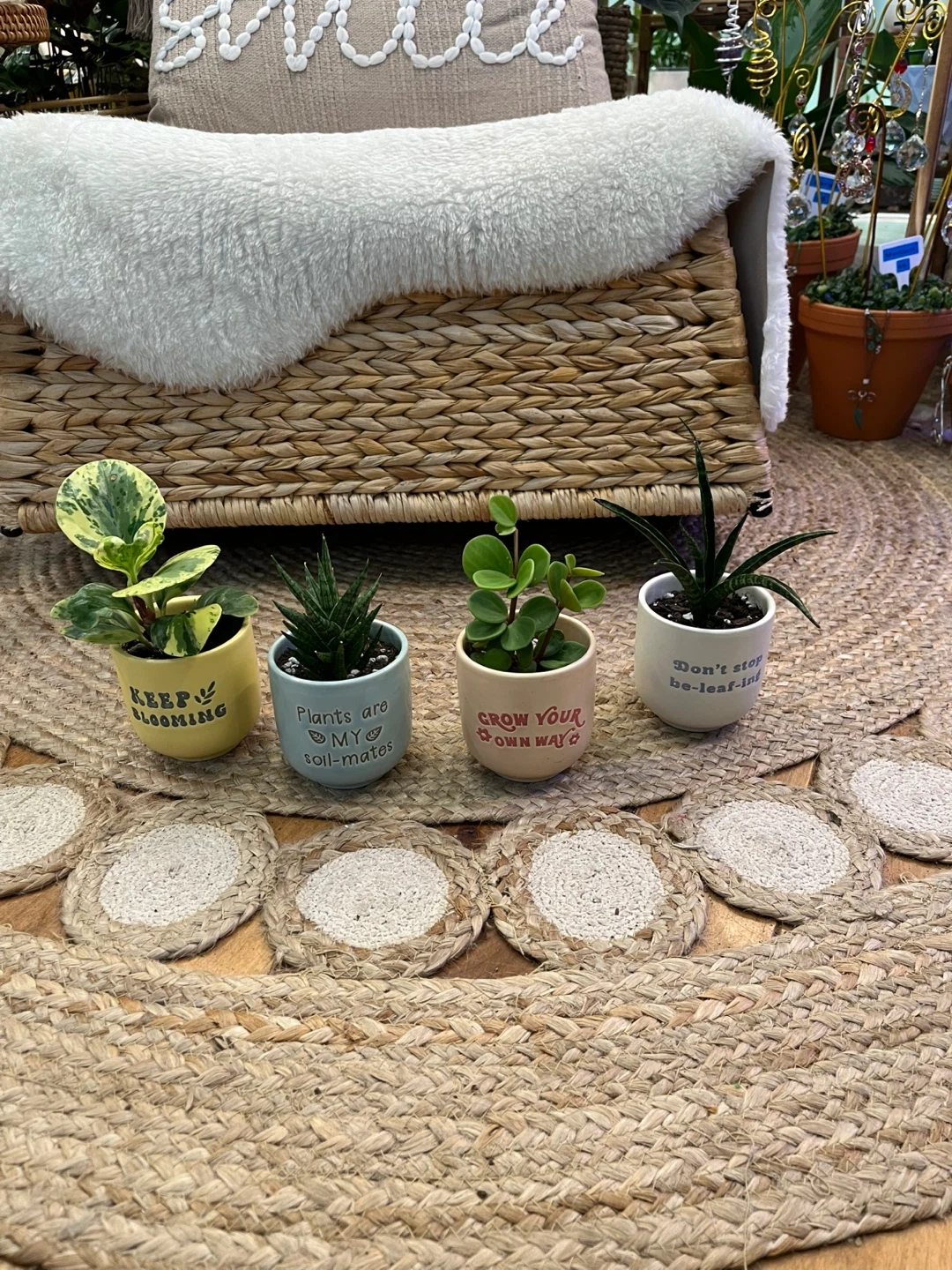 - Blue pot: "Plants are my soil-mates"-Sansevieria Francisii Spikey