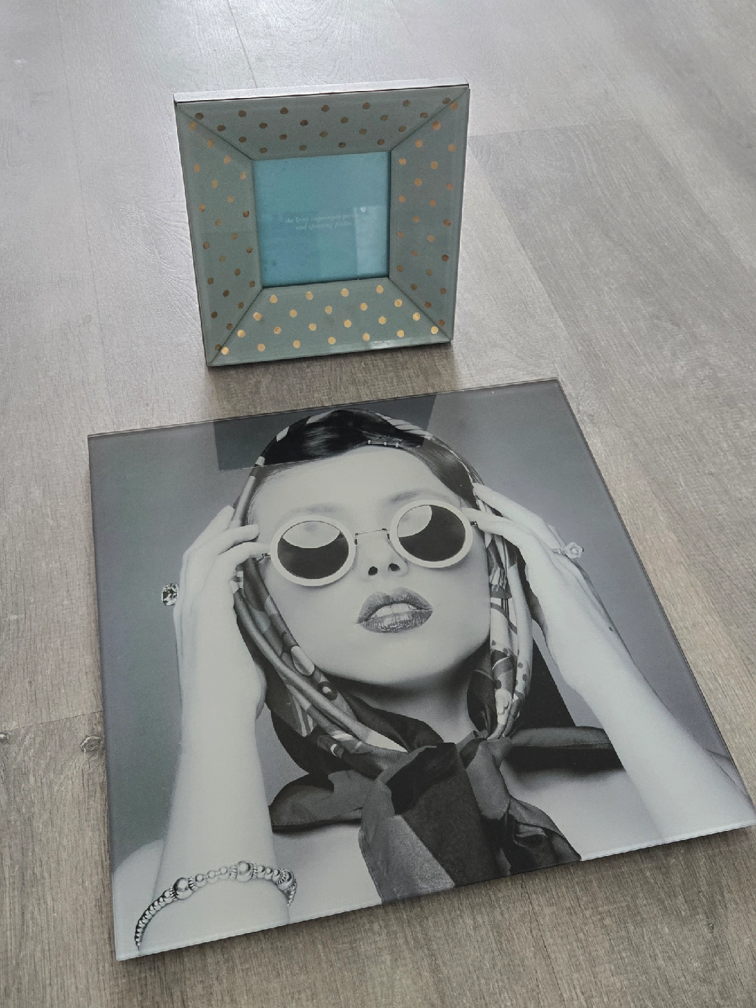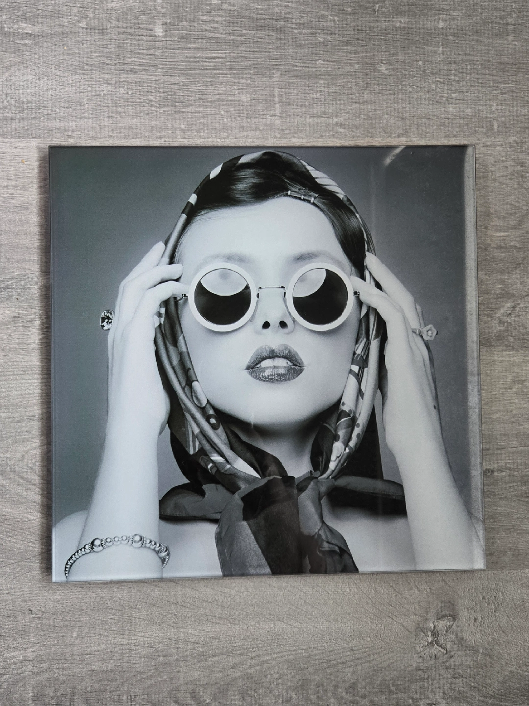 125Stylish wall art featuring a woman with a scarf and sunglasses. It's in great shape and ready to add a touch of elegance to your space! Comes with mounting hardware on the back for easy installation. $15 FIRM!! Glass Wall PHOTO Tile