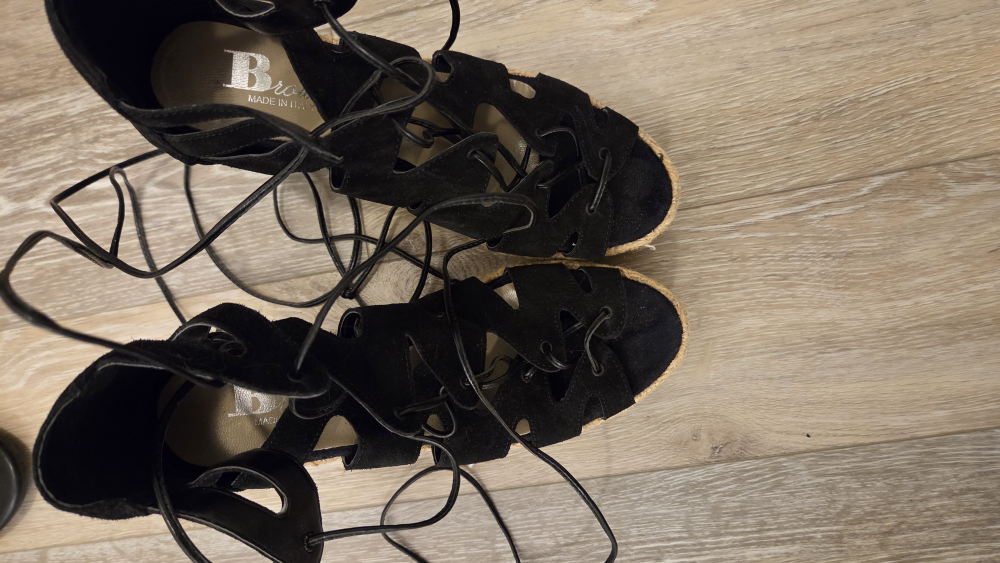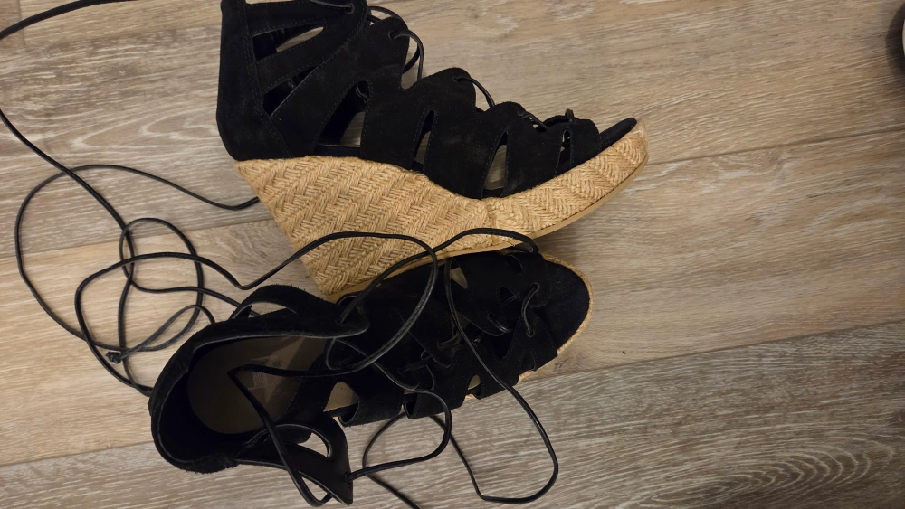 These Browns lace-up wedge sandals are a stylish addition to any wardrobe! They feature a black suede-like material and a unique lace-up design that wraps around the ankle. The wedge heel is made of a woven material, adding a touch of texture and height. Perfect for a night out or a special occasion