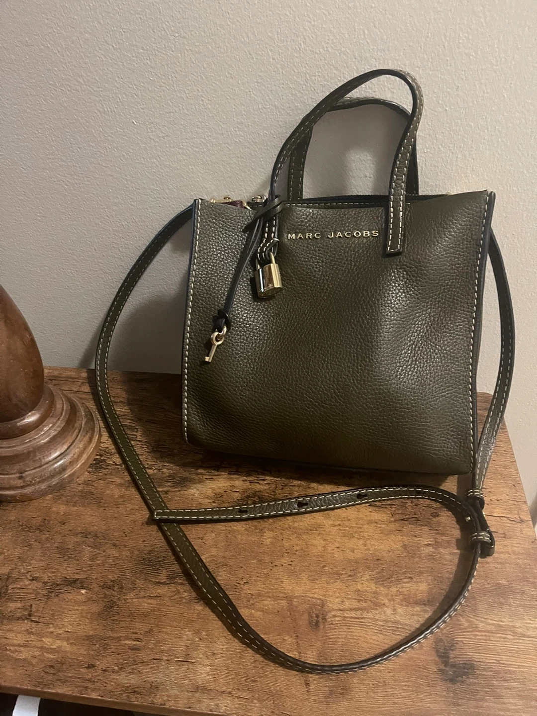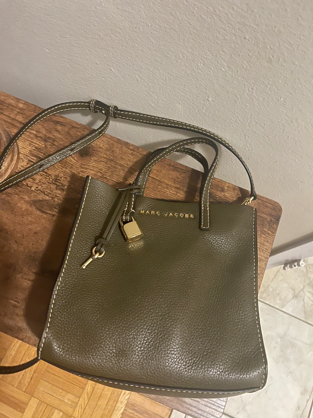 Selling a cute Marc Jacobs mini tote bag in an olive green colour. It's in great condition and perfect for everyday use! The interior is a nice red colour.