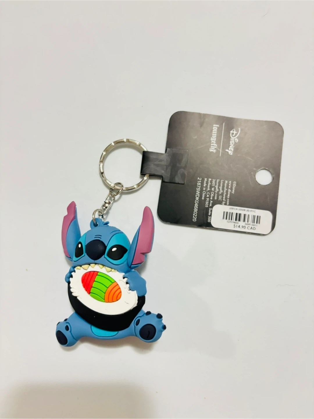 This is a Loungefly keychain of Stitch from Disney's Lilo & Stitch, and he's enjoying some sushi! The tag shows that it retails for $14.50 CAD. It's in great condition and ready to add some fun to your keys or bag